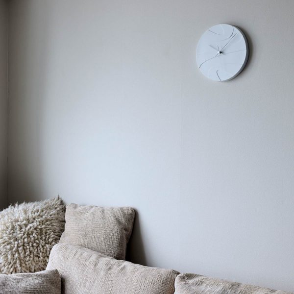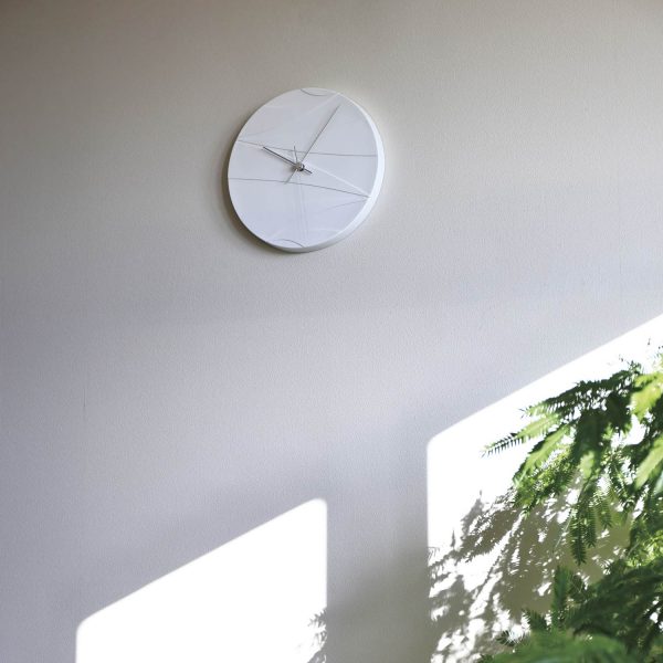 磁器素材に凹凸のレリーフラインを施した時計です。円周を12等分しながら表面は異なる面積で分割しています。
