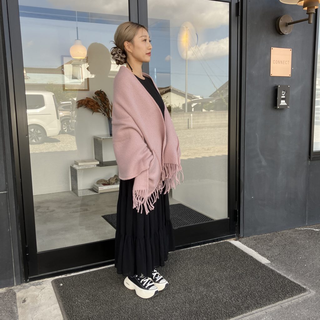 秋冬は暗い色味のお洋服が多くなりがちですが、綺麗なカラーのUNIショールを合わせることで、顔周りがぱっと明るくなります。