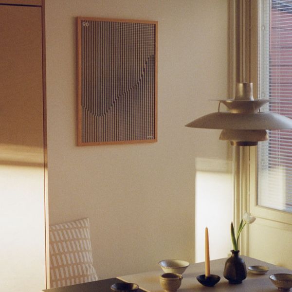 フィンランドの現代アーティスト、インカ・ベルがデザインしたこのポスターは、アルヴァ・アアルトの「スクリーン100」から着想を得ています。シルクスクリーン技法を駆使して、オリジナルのスクリーン100の輪郭を再解釈することで、予期せぬ美しさと見慣れた心地よさが両立したデザインが生まれました。くっきりとした幾何学模様と、そこに宿る人間味は、Artekとアーティストに共通する視覚言語として、ポスターに表現されています。