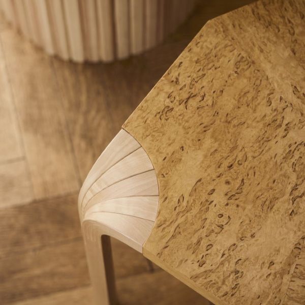 六角形の座面には、カーリーバーチの突板が組み合わされており、カーリーバーチは、不規則な波状の木目がまるで炎のように渦巻く、フィンランドバーチの中でも希少な亜種です。