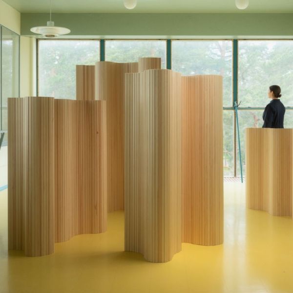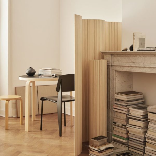 用途や好みに合わせて曲線を変えて展開でき、コンパクトに巻いて収納することも可能。設置・移動も簡単かつ安定性に優れた「スクリーン100」は、アアルトのデザインの特徴である、自由で有機的なフォルムを暮らしに取り入れることができる製品です。パイン材を垂直に並べて繋ぎ合わせたシンプルな構造は、空間に自然の温かさと柔らかさを添えます。