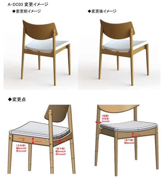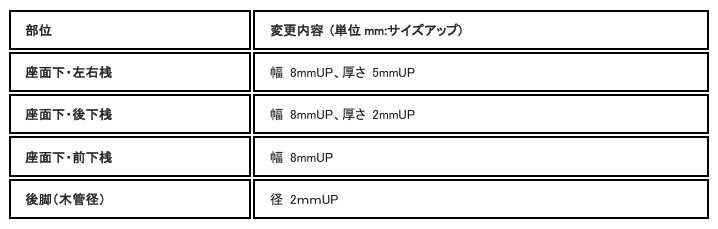 今回のリニューアルの核となるのが、椅子全体の耐久性の向上です。 外観の美しさはそのままに、座面下の前後左右の部材サイズを見直し、接合部の強度をさらに高めました。 毎日使う椅子だからこそ、目に見えない構造部分にまでこだわり、これまで以上に末永く安心してお使いいただける設計へと進化しています。