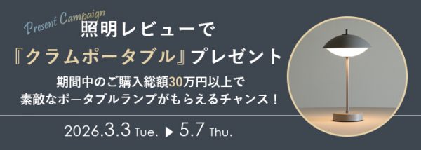 現在、照明総額30万円以上ご購入 + 公式LINEにレビュー投稿で、Fritz Hansenのクラムポータブルをプレゼントするキャンペーンも同時開催中です。