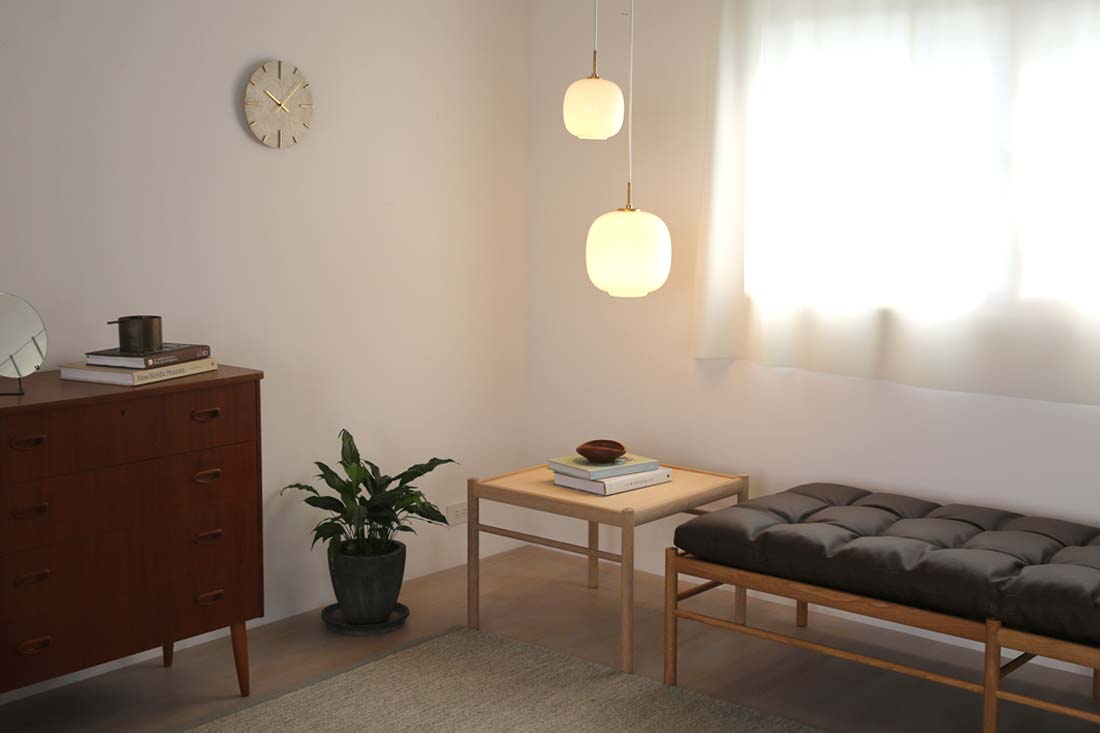 正方形という形は、異なる家具同士を繋ぐ最高の「ハブ」になります。例えば、デイベッドと2脚のチェアの間にOW449を配置。長方形のテーブルに比べて、どの席からもアクセスしやすく、自然と視線が中央に集まる「対話の場」が完成します。正方形が織りなす幾何学的な秩序が、リビングのレイアウトに美しい調和をもたらします。