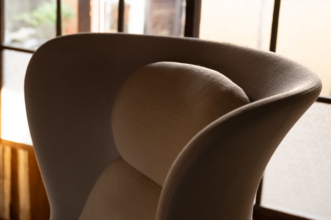滑らかな曲線が場の緊張感をやわらげ、見るからに心地よいこの椅子に腰かければ、周囲の賑わいから切り離された、自分だけの居場所が静かに立ち上がります。