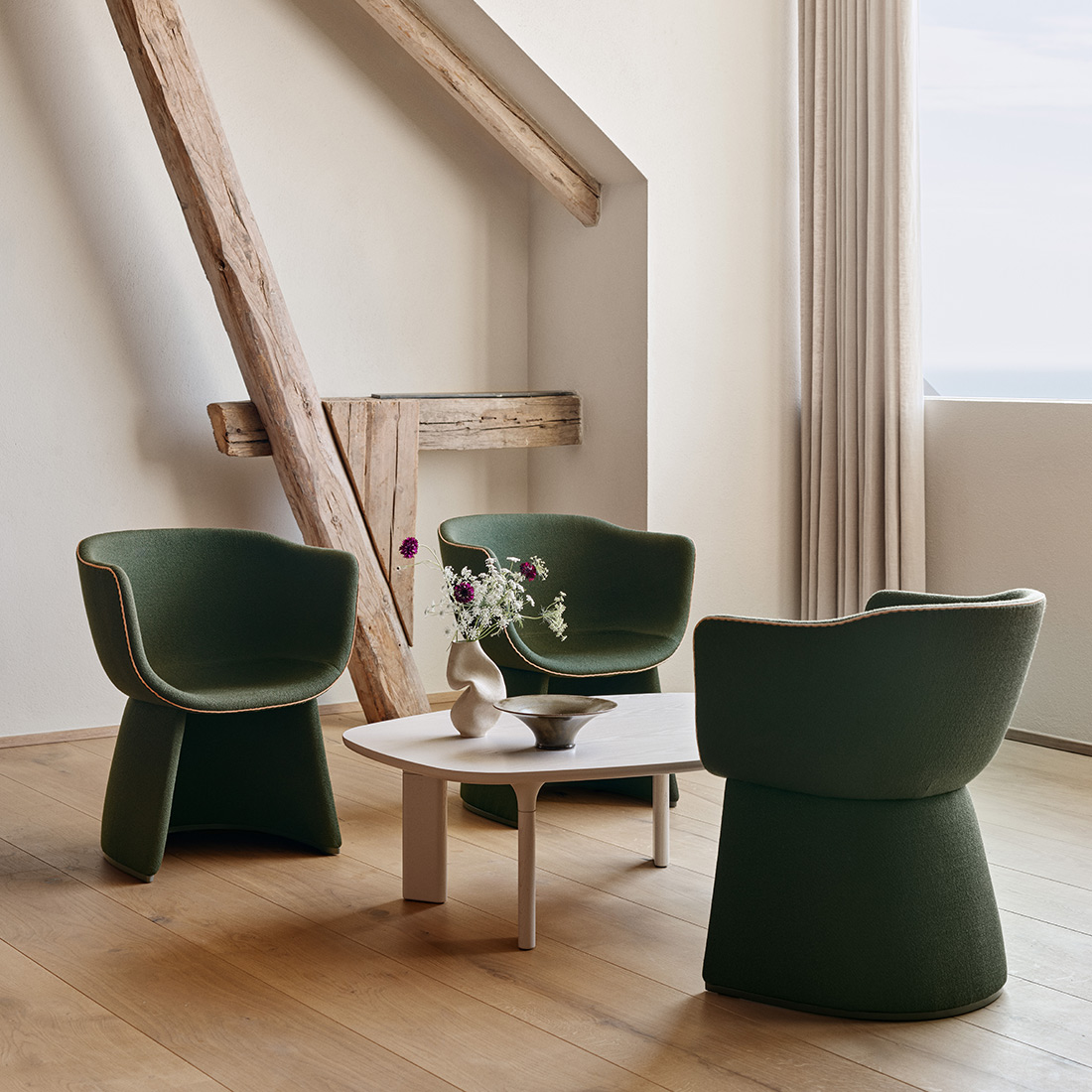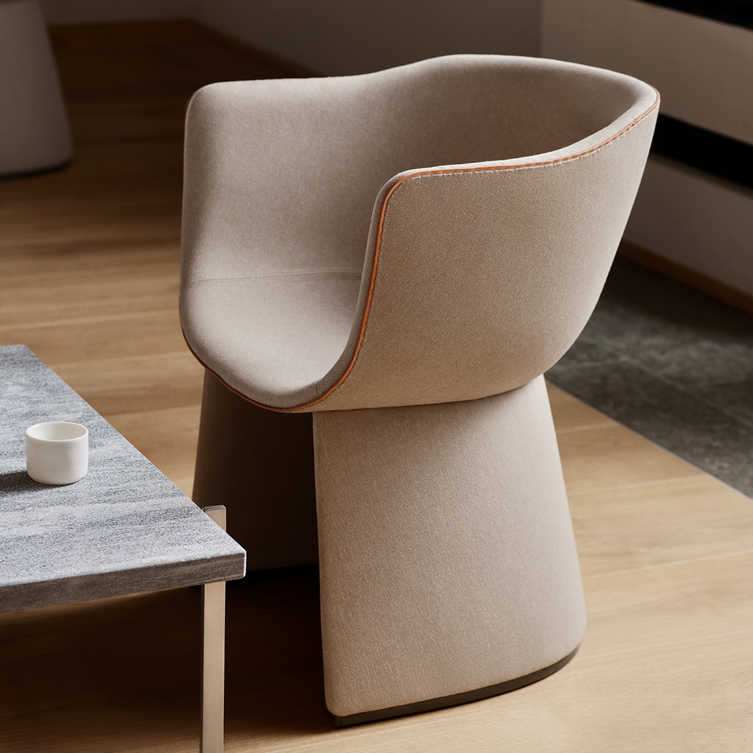 単色ですべて同じ張地にすれば、統一感があり、シンプルで洗練された印象になります。空間に馴染みやすく、他の家具やインテリアを邪魔しません。素材感そのものが際立ち、モノリットの彫刻的なフォルムがより強調されます。
