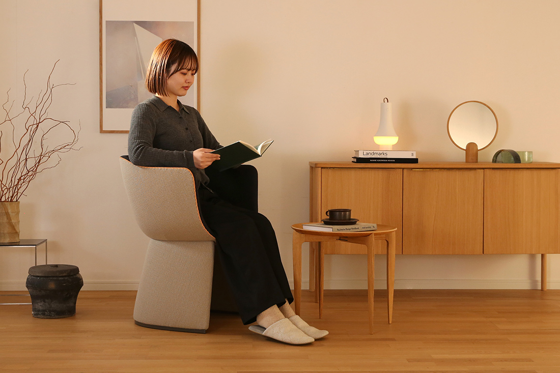たとえば、家族や友達がソファで話している隣で、モノリットに座って静かに本を読んだり、考え事をしたり。ひじ掛けを存分に使って、それぞれが好きなようにリラックスして過ごせます。