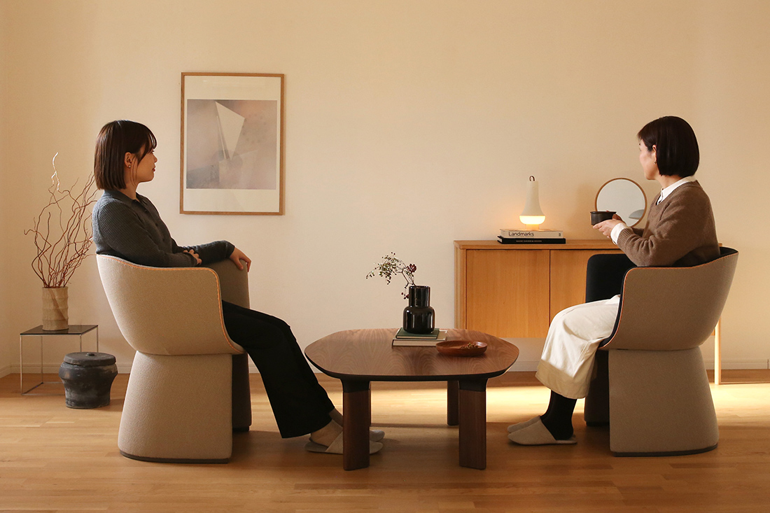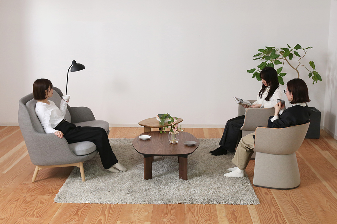 向かい合わせに配置すれば、お客様を呼んでのティータイムにぴったり。間にローテーブルを挟むことで、自然と会話が弾む心地よい距離感が生まれます。