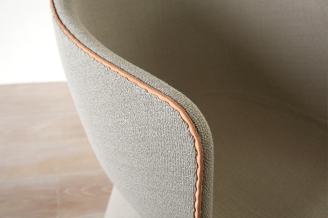 使用されるのは「ハーネスレザー」という、非常に硬く、しっかりとした素材。この切りっぱなしのデザインが、単に見た目を引き締めるだけでなく、チェア全体に気品と重厚感をもたらします。可愛らしくなりがちな柔らかなフォルムに、ぴりっとしたスパイスを加えることで、より洗練された印象へと昇華させます。