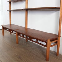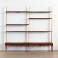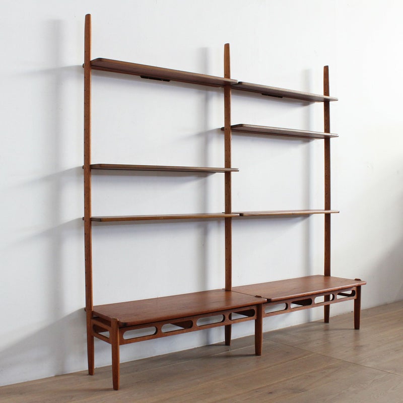 1950~1960年代頃にヨーロッパで活躍したアメリカ人デザイナー、William Watting(ウィリアム・ワッティン)がデザインを手掛けたウォールシェルフです。 上下が分離し、最上段の棚板を壁に固定する事で自立します。棚板の下に長いネジを通し、両サイドから引きつけ合う事で固定されます。棚板はチーク材、その他はオーク材を使用しています。 非常にシンプルな造りでありながら、デザインの美しさには目を見張るものがあります。日本のヴィンテージ市場では殆ど見かけない希少なアイテムです。