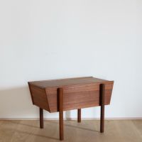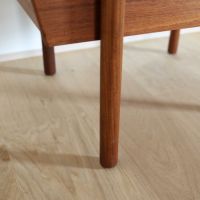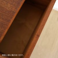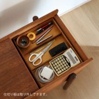 美しいチークの素材が目を引く、上品な雰囲気のソーイングテーブルです。 中の小物入れは仕切りが取り外せるので、細かなものを整理するのにも便利です。 小物入れの下にも収納するスペースがあり、読みかけの本や膝掛けなどの収納もできそうです。 天板は半分ほど開けると止まる構造になっており、左右どちらからでも中のものを取り出すことができます。 持ち運びができるサイズなので、サイドテーブルとしても使えそうです。