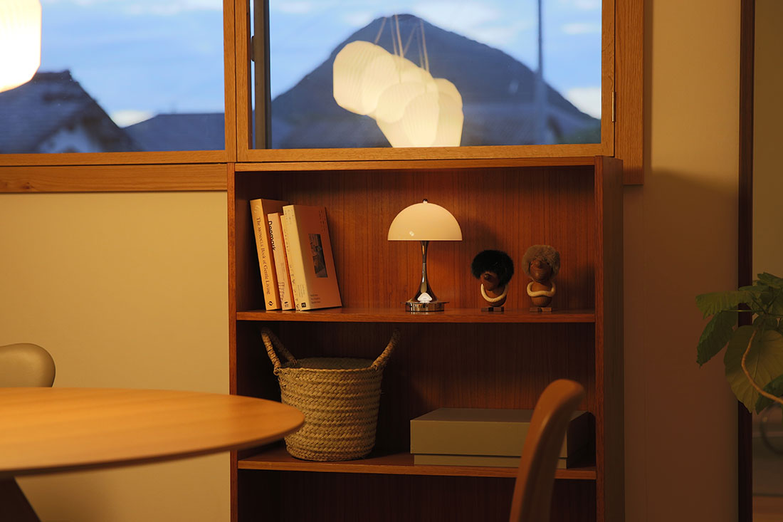 ルイスポールセンの照明は、光源が直接目に入らないよう設計されています。半透明のオパールシェードは、点灯すると素材そのものがふわりと発光。周囲を穏やかな光で満たし、空間全体を柔らかく包み込みます。