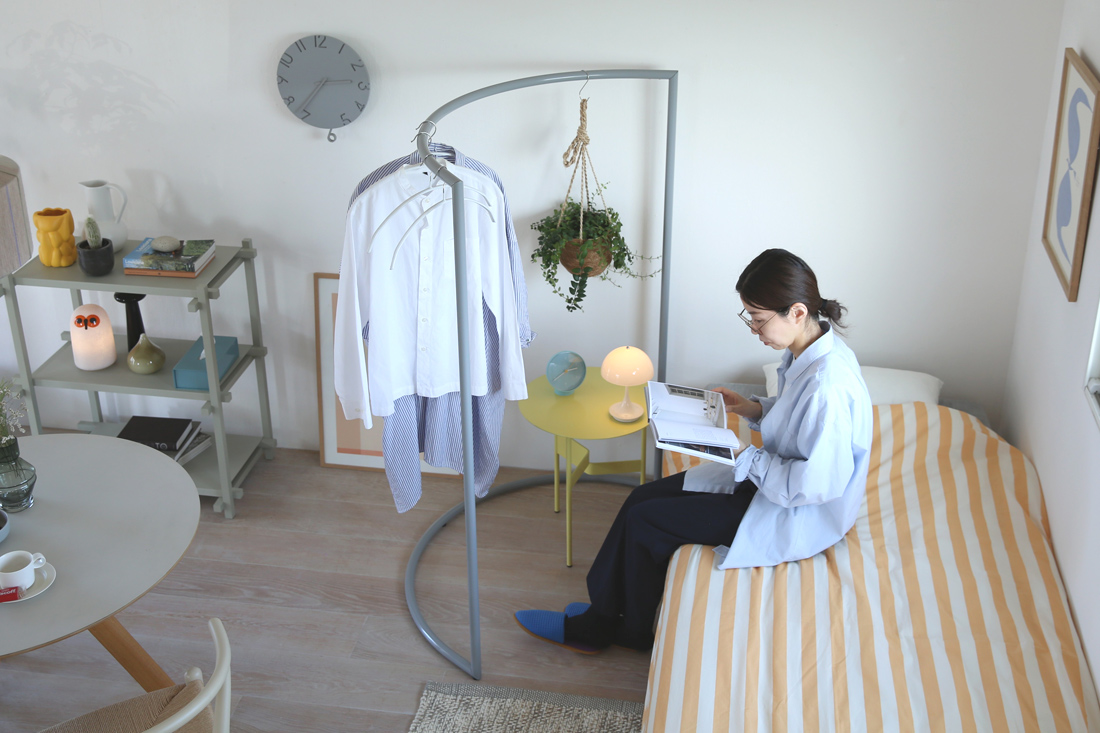 「私は洋服だけでなく、グリーンやアートを飾る『魅せるシェルフ』として使っています。インテリアがぐっとモダンになりました。シンプルなデザインですが、設置や移動も簡単で、気軽に模様替えできるフレキシブルな便利さが気に入っています。」