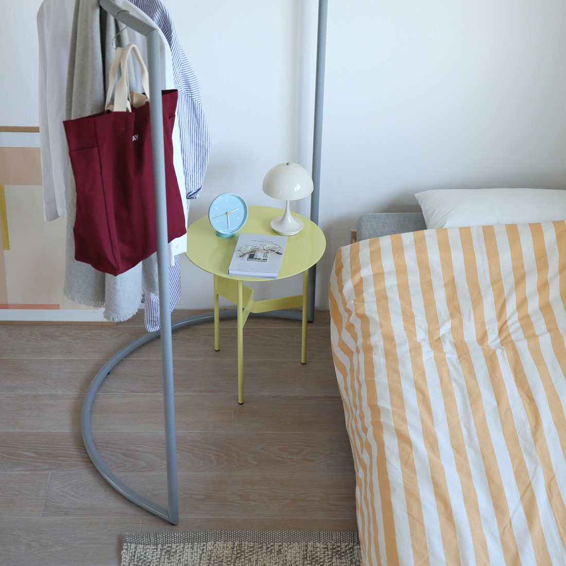 C型の下のデッドスペースにサイドテーブルを置くと機能性が一気にアップします。カラーラックには洋服を吊り、下のサイドテーブルにはアクセサリーや時計など、日常で身に着けているものを置く場所として活躍してくれます。