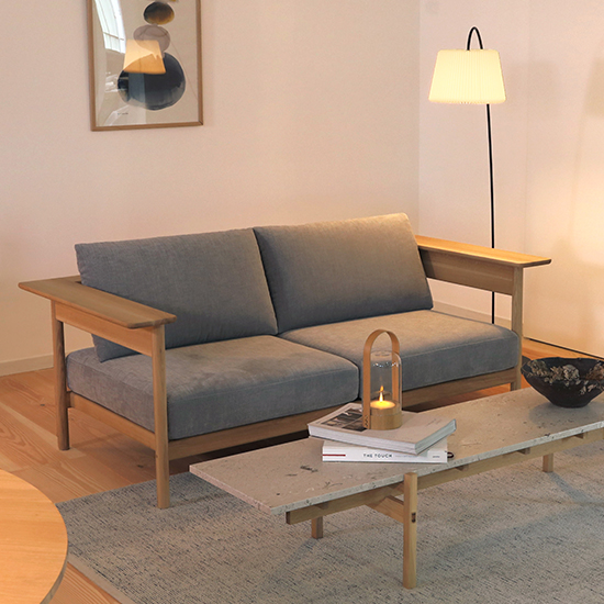 2人掛け~3人掛けのちょうどいいサイズ感と、洗練されたシンプルなデザインのソファ。他のリビングアイテムとのコーディネートのしやすさが抜群。