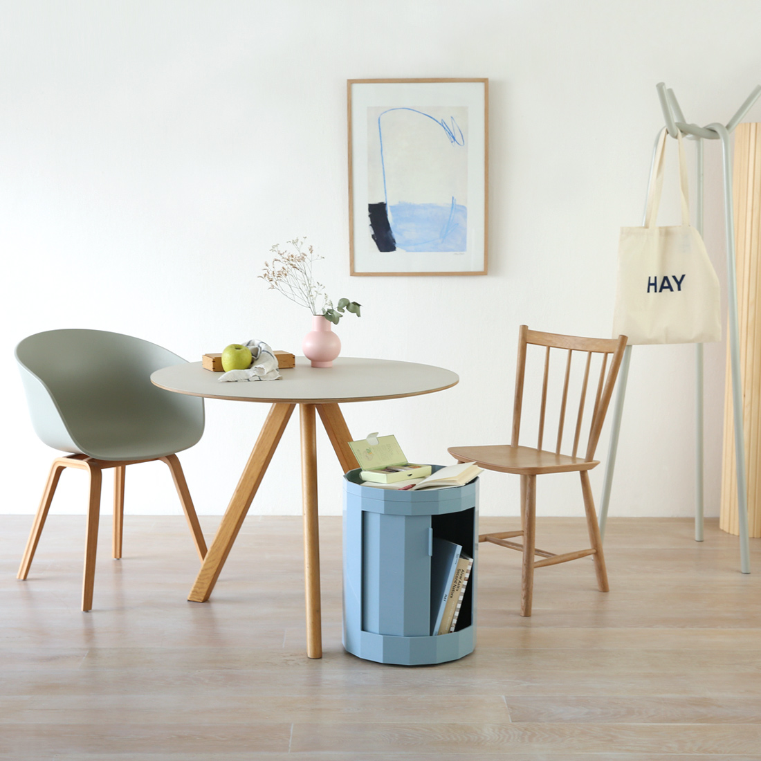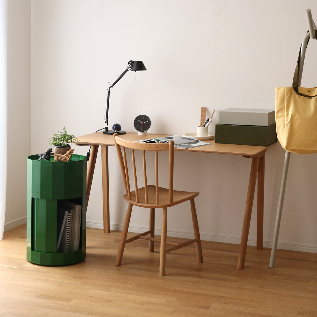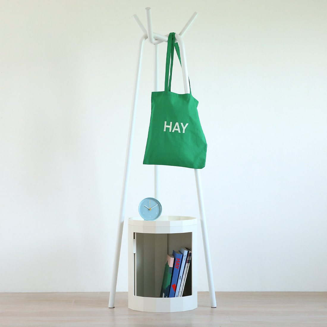 ▲HAYのコートラック「KNIT」の脚元のデッドスペースにLOWタイプがぴったり収まります。ちょっとした小物を置く場所として活躍してくれます。
