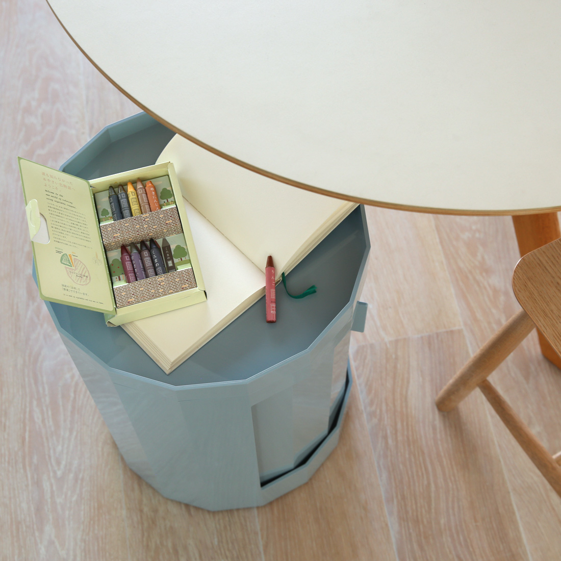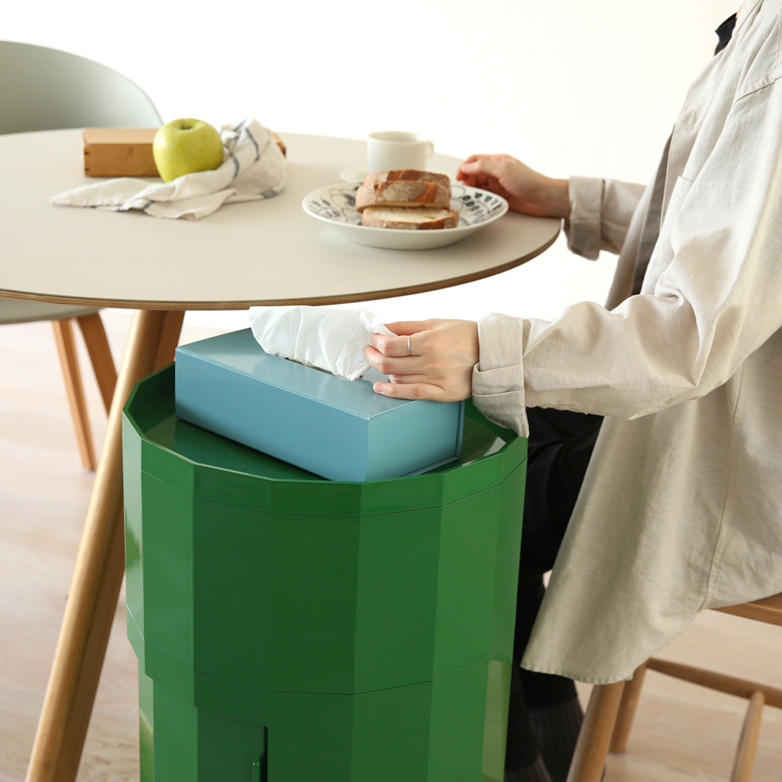 上の蓋は取外し可能になっており、上から簡単に出し入れすることができます。また飲み物を乗せて、そのままトレーとして使うことも。ファセットキャビネットのHIGHタイプの方は、上の蓋を取ると収納ボックスになっており、デスク横におけば文房具や書類、配線ケーブルなどの収納として役に立ちます。