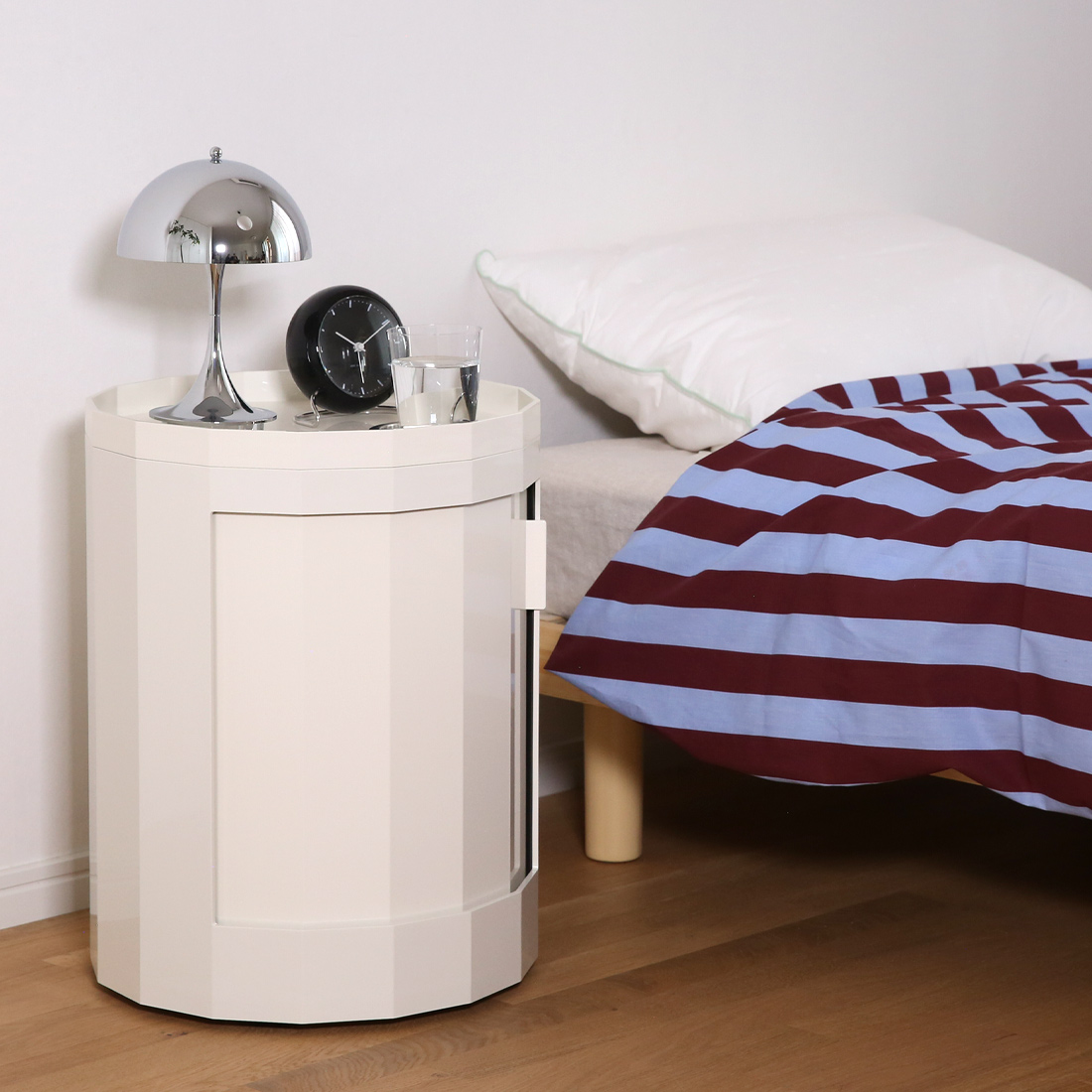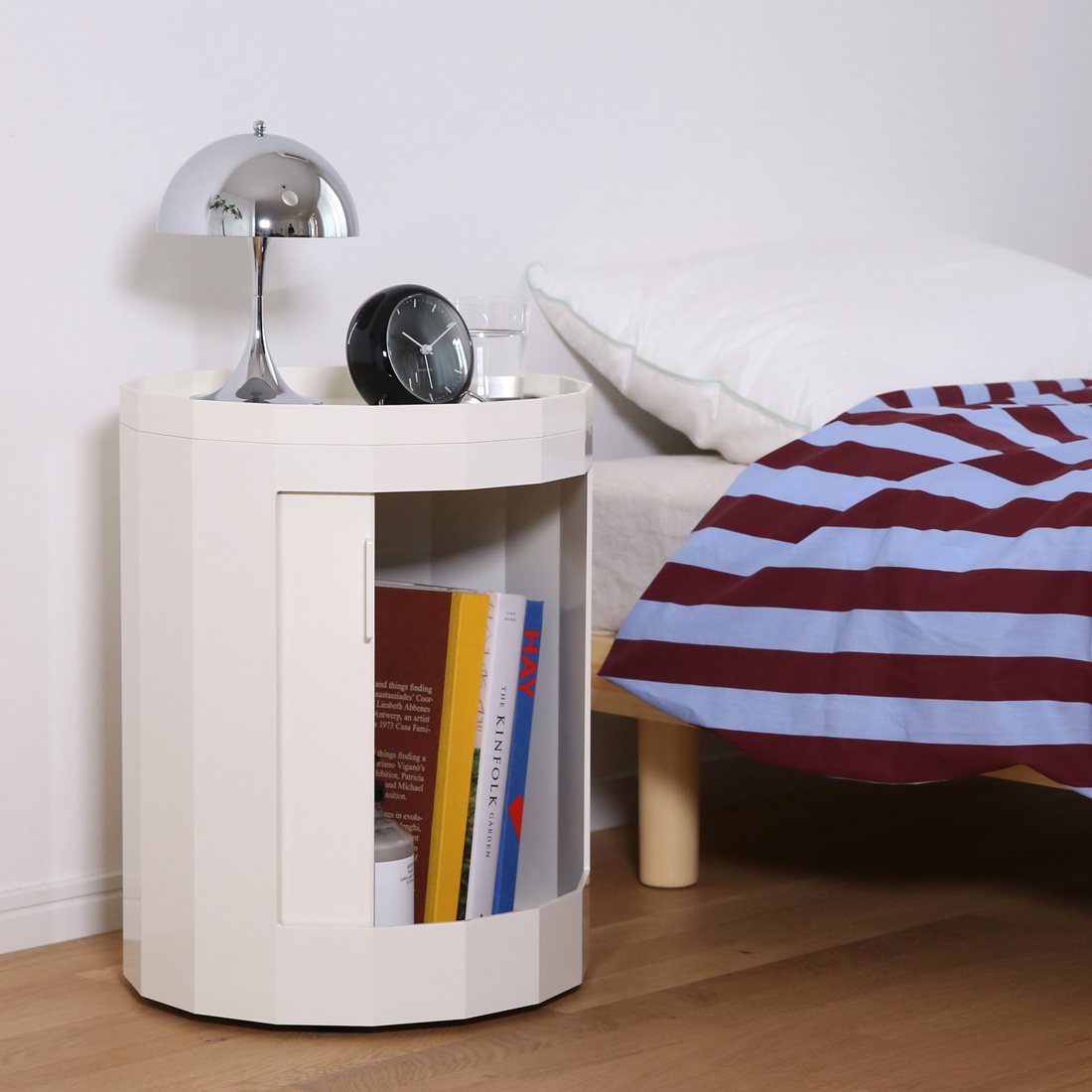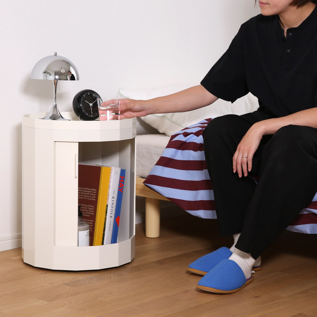 ▲寝室のナイトテーブルに最適。読みかけの本を収納したり、天板のトレーに飲み物やポータブルランプを置いて、ゆったりとした時間を過ごせます。