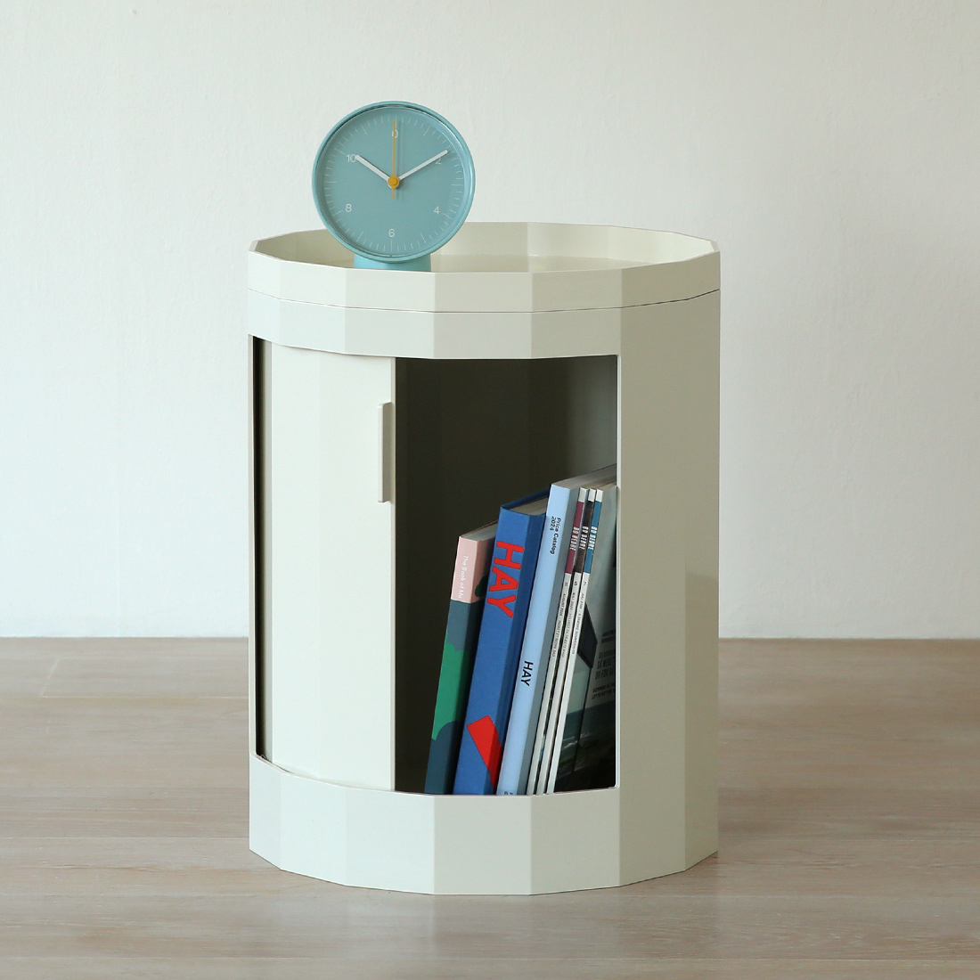ファセットキャビネットの1番の特徴とも言えるのが、この回転式ドアです。最大横幅:約30cm、高さ:約33.5cmあり、持ち手を右から左にスライドすれば、大きめの本や雑誌なども気軽に収納することができます。開け閉めもとてもスムーズで、ストレスフリーなのもうれしいポイントです。