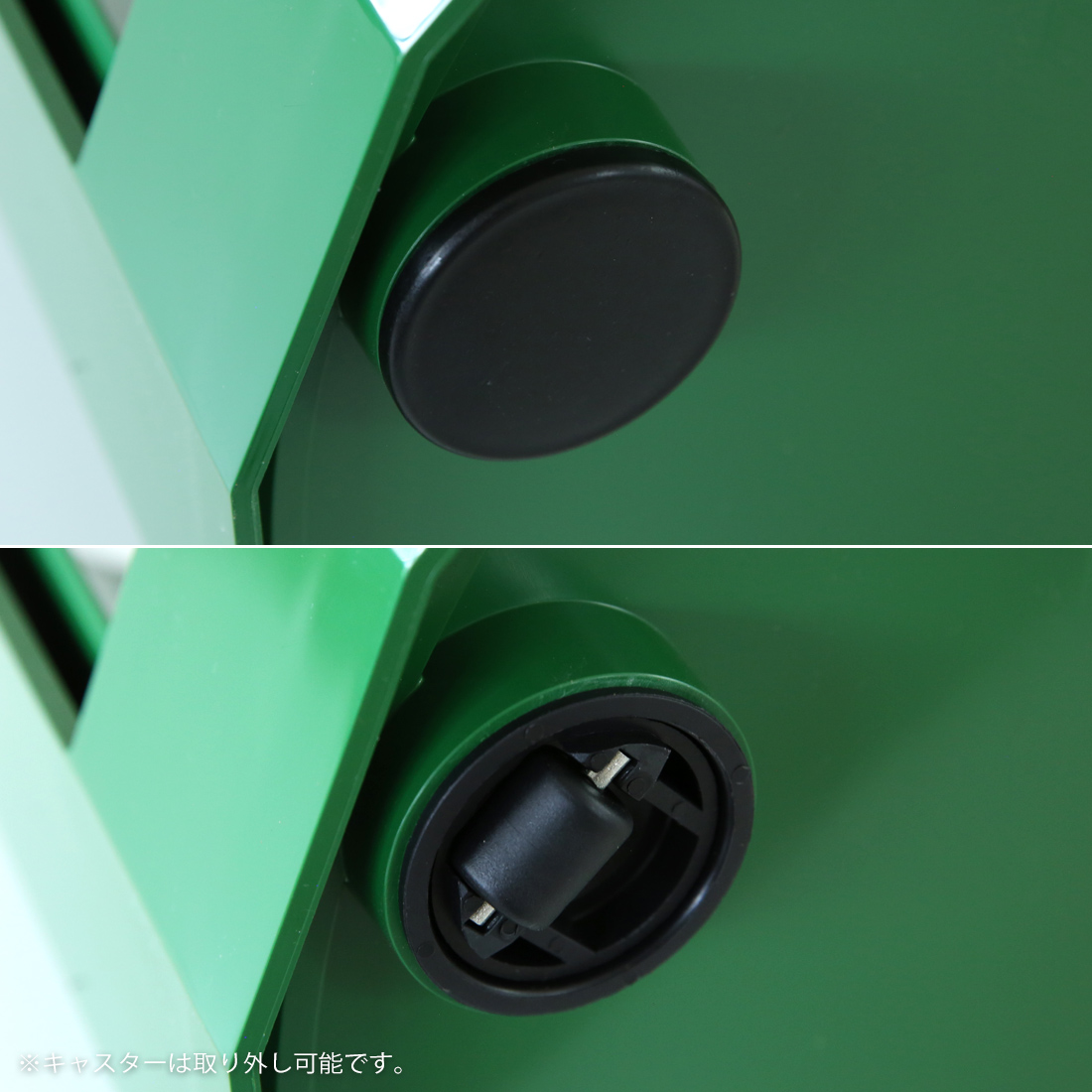 付属でキャップとキャスターが付いており、置く場所を固定する場合はキャップを、移動する場合はキャスターを選んで付けることができます。キャスターにすればリビング、ダイニング、デスク周りなどどこにでも楽に移動ができ、掃除もしやすくてとても便利な機能です。