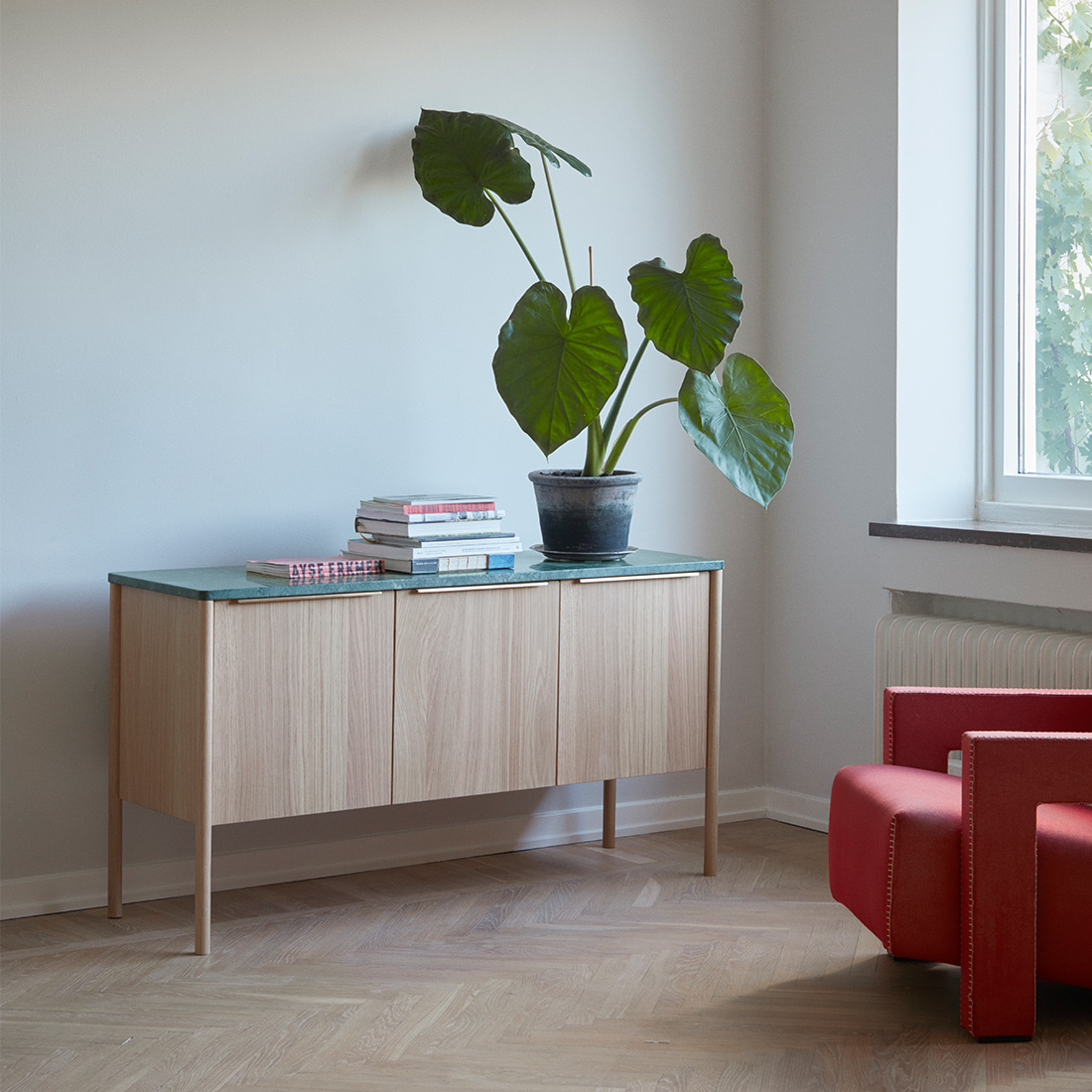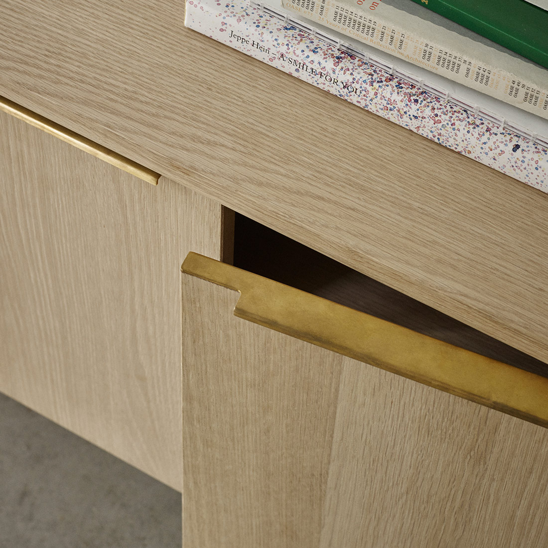 Jut Cabinet(ジュット キャビネット)はリビングや廊下に最適なモダンなキャビネットです。長く丸い脚は外側の角に配置され、扉に付いたスマートな真鍮の取っ手は天板と一直線に並んでいます。左側の扉には仕切りがなく、中央と右側の扉にはそれぞれ取り外し可能な棚で仕切られています。天板はオーク材と大理石があります。