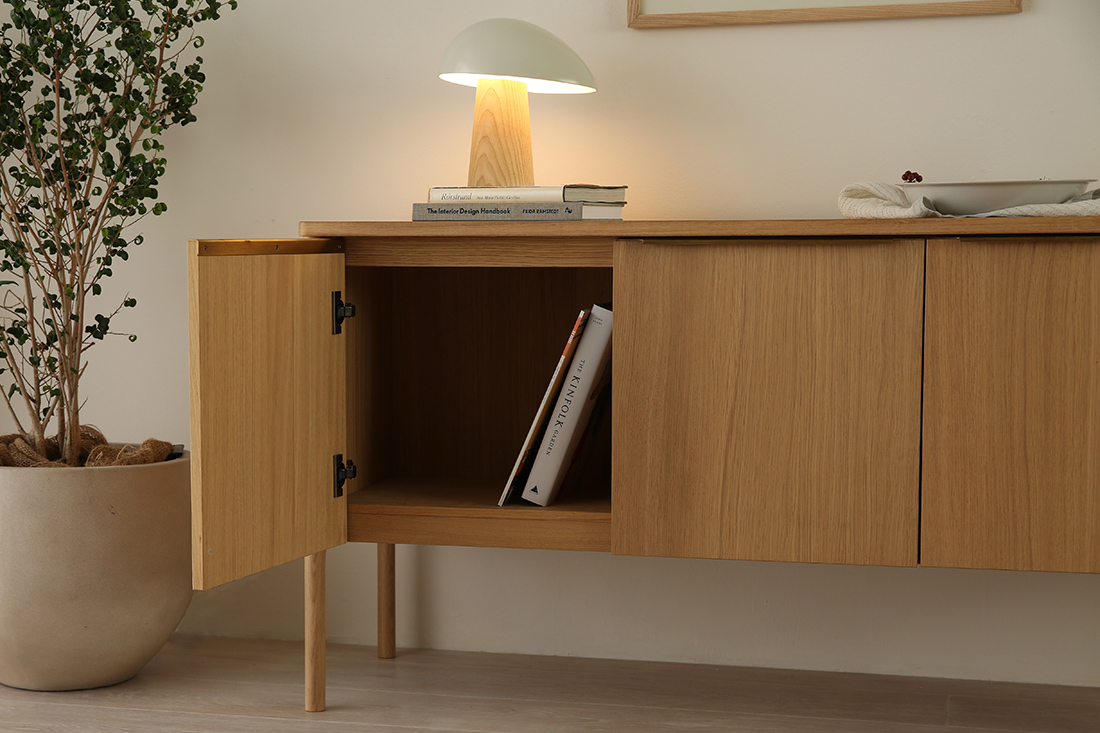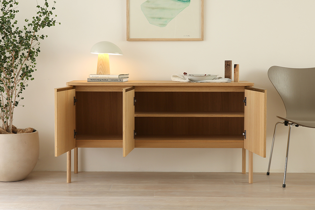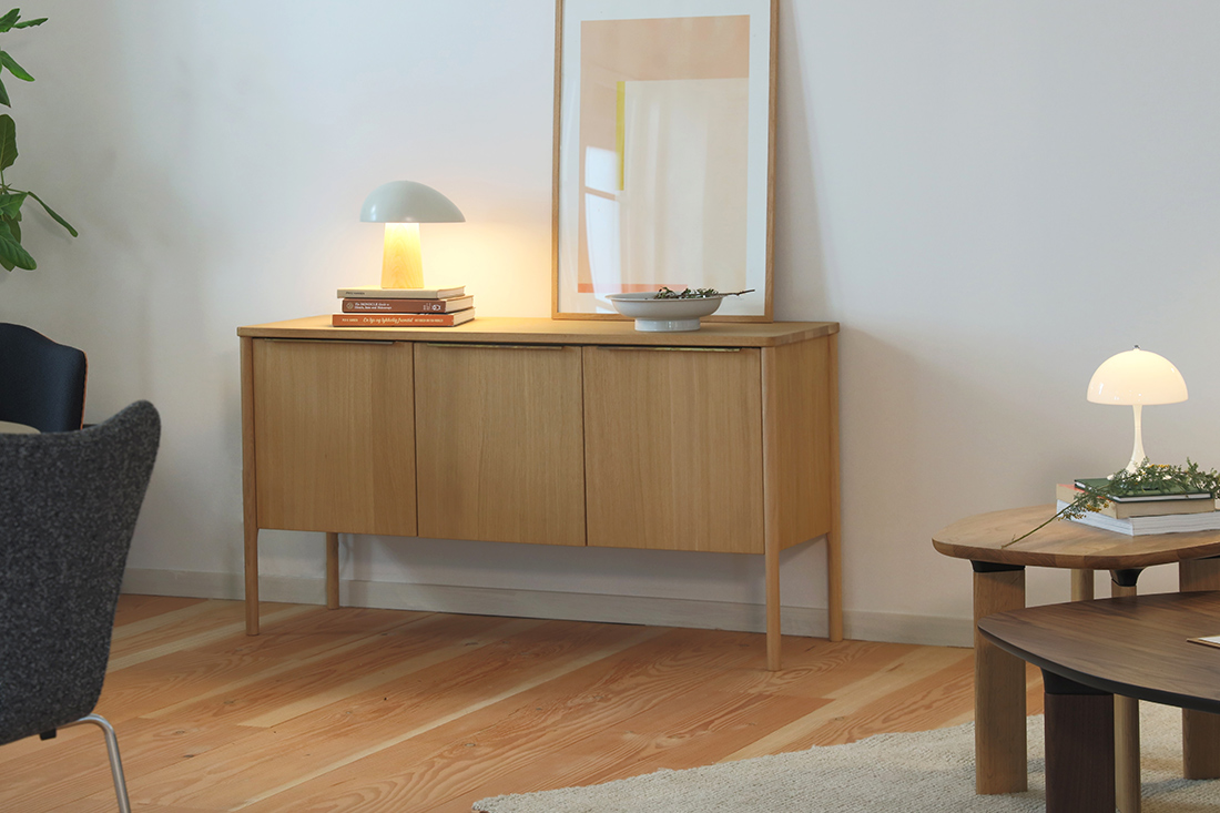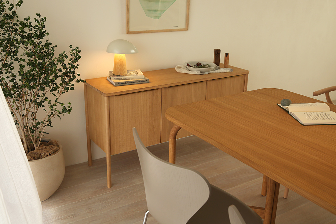 スチールの無機質さや、ヴィンテージの濃さとも違う。オークのやさしい質感を生かしたこのキャビネットは、北欧インテリアをベースに、モダンからナチュラルまで、さまざまな空間に自然と溶け込みます。これまでありそうでなかった、北欧の収納家具なのです。