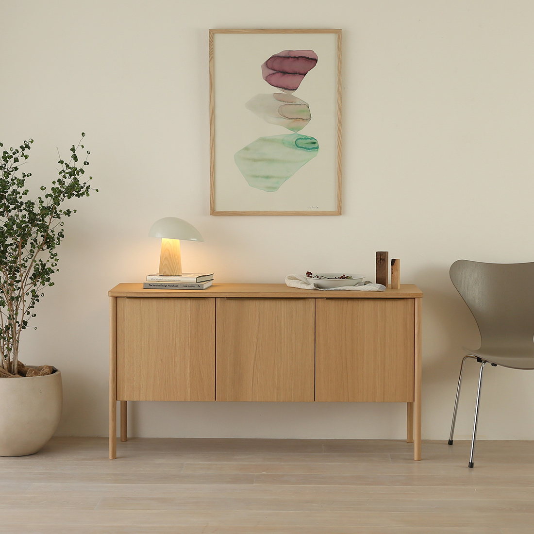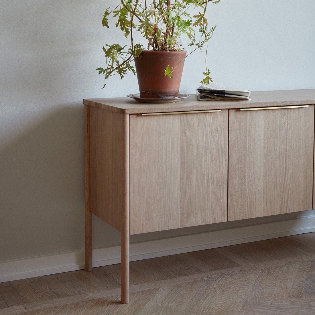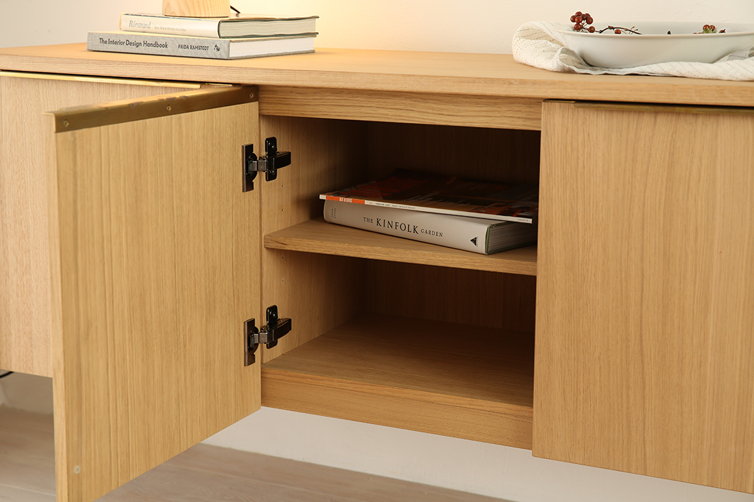 スチールの無機質さや、ヴィンテージの濃さとも違う。オークのやさしい質感を生かしたこのキャビネットは、北欧インテリアをベースに、モダンからナチュラルまで、さまざまな空間に自然と溶け込みます。これまでありそうでなかった、北欧の収納家具なのです。