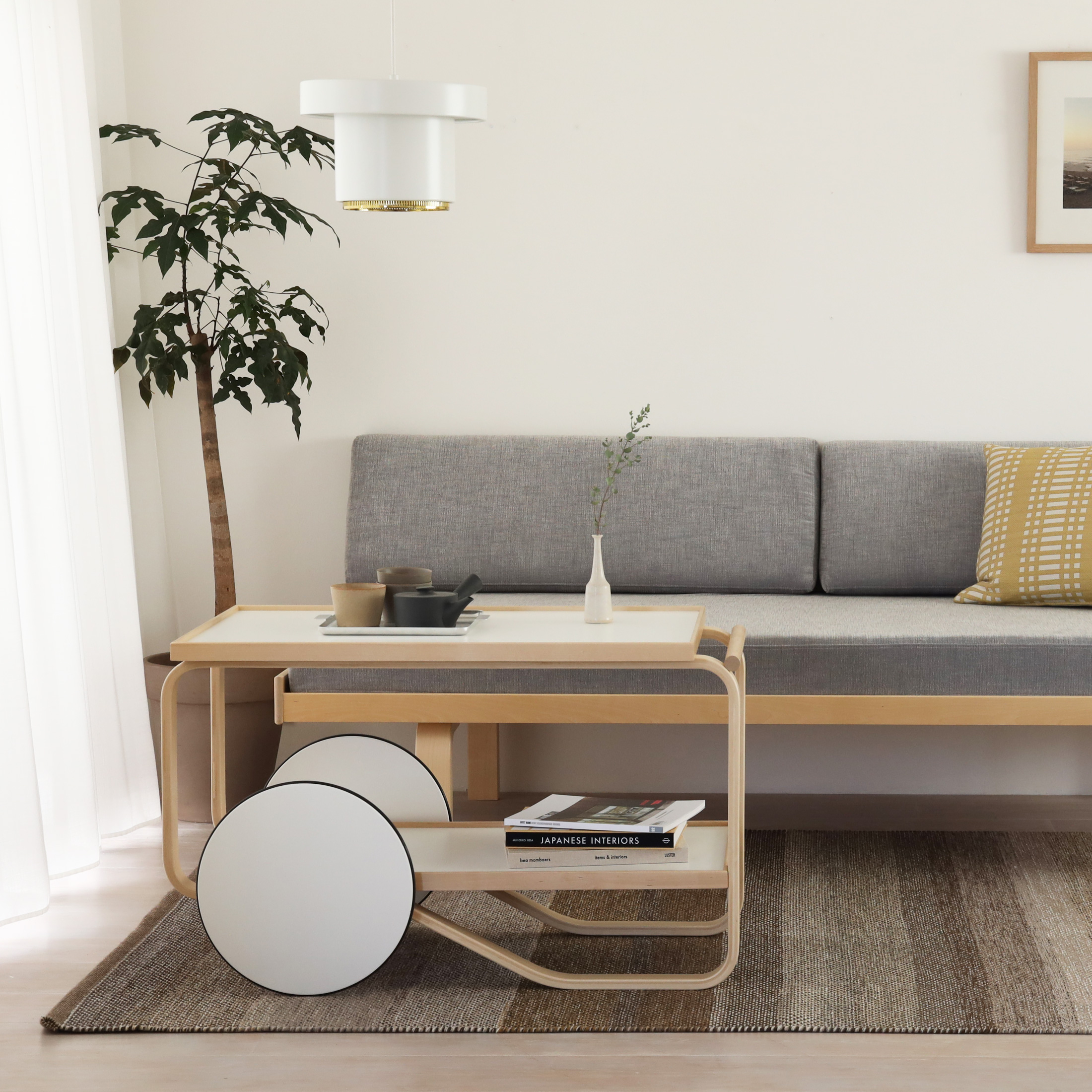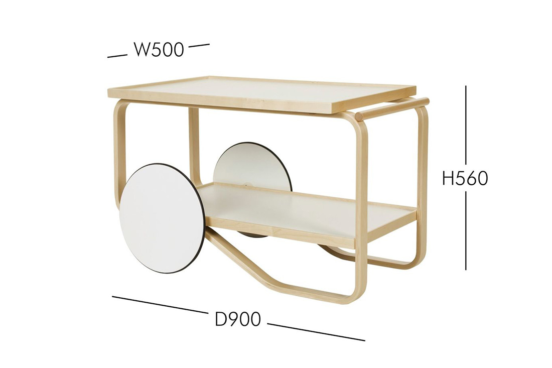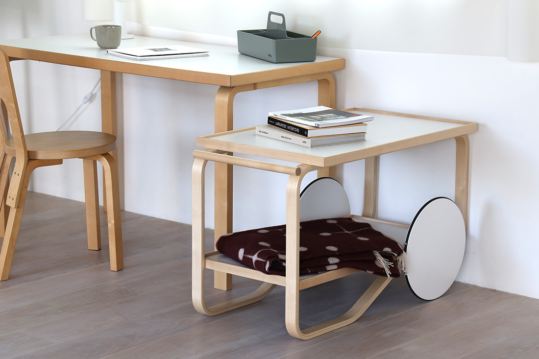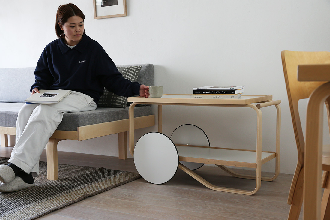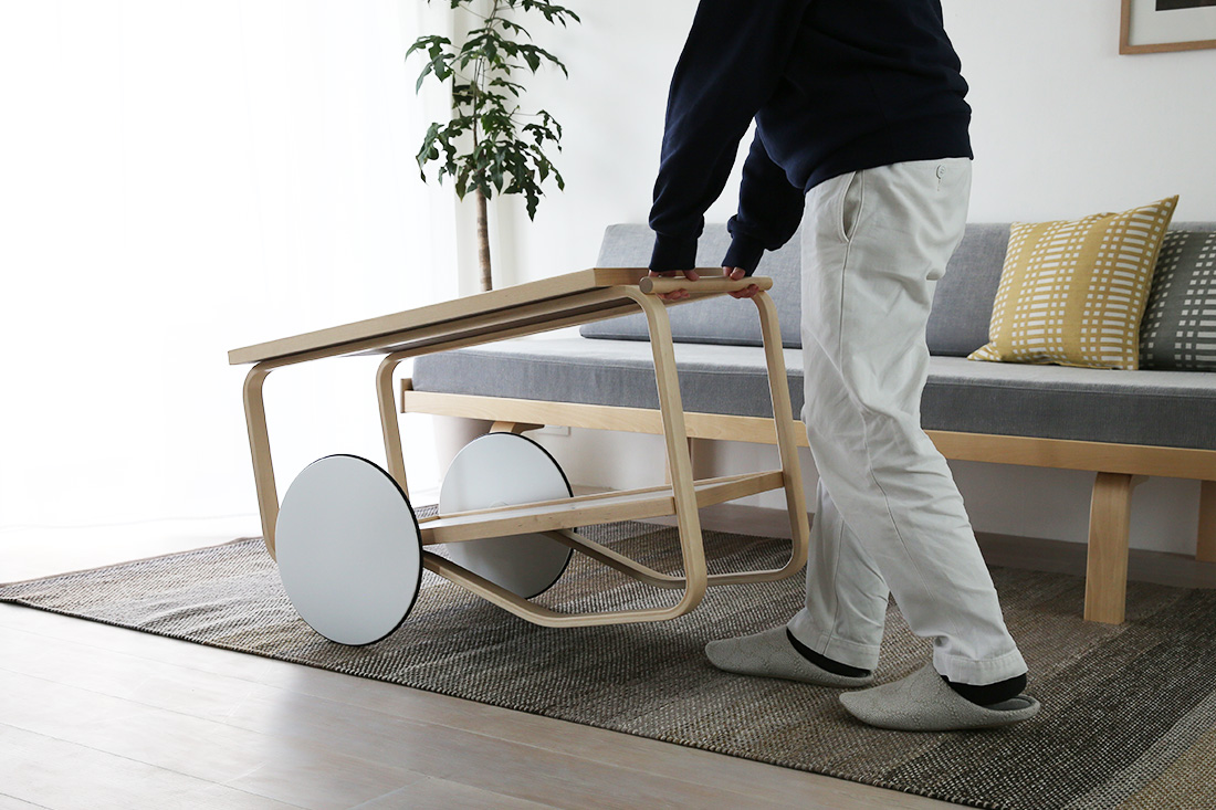 Artek(アルテック)ティートロリーは、フィンランドの巨匠アルヴァ・アアルトがイギリスの紅茶文化と日本の木工技術にインスピレーションを受けて1936年にデザインした作品です。特徴的なラメラ曲げ木のフレームは、バーチ材の合板を柔らかく曲げることで、無垢材のような滑らかなカーブを実現しています。