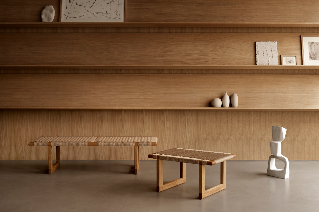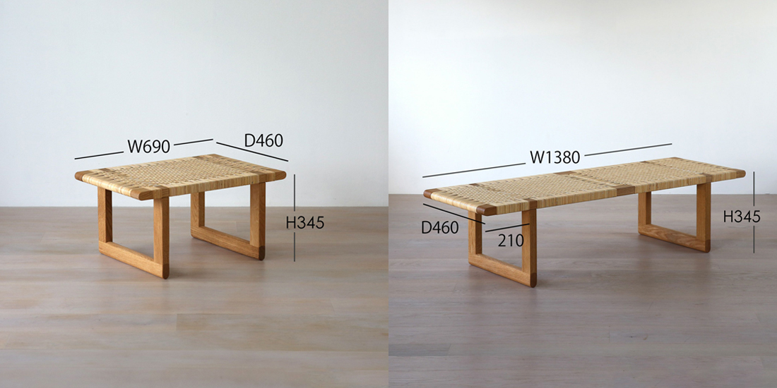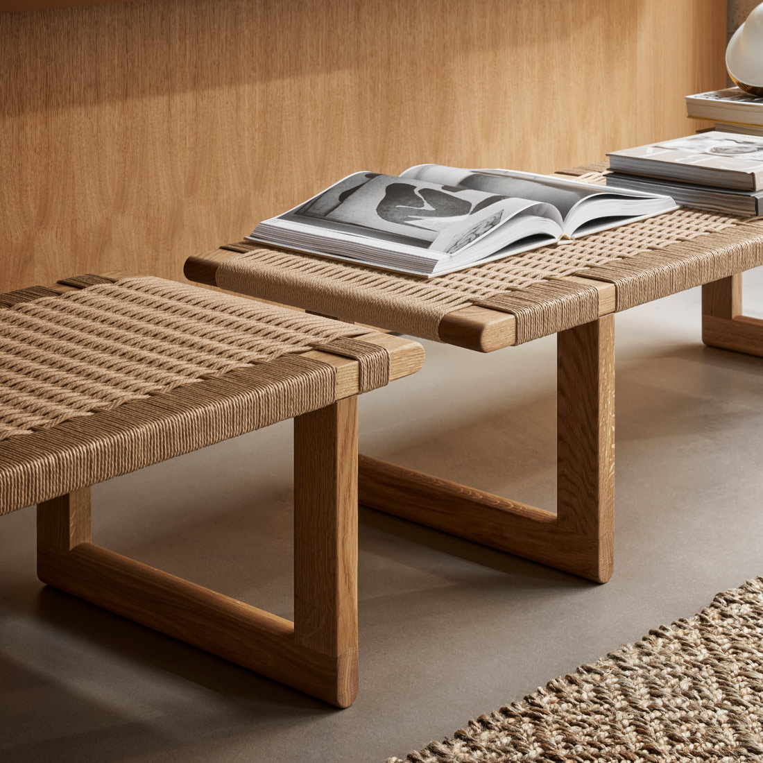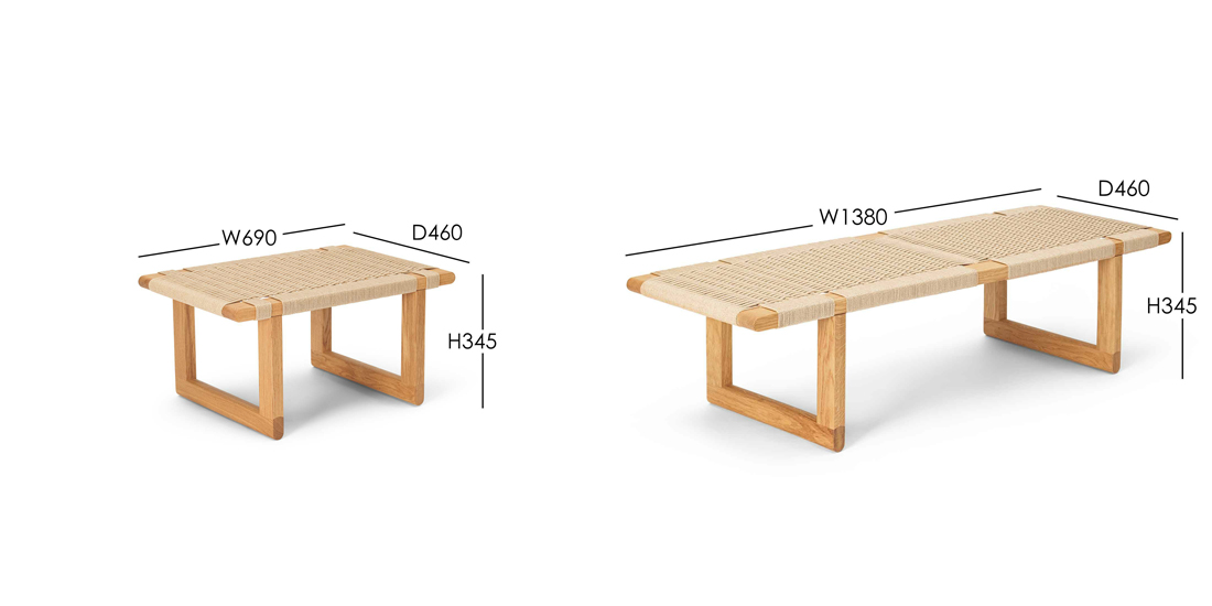 2020年にカール・ハンセン&サンのラインナップに加わった籐張り仕様のBM0488、そして今回新登場したペーパーコード仕様のBM0489。ともにショートとロングのサイズ展開があり、他の家具と組み合わせて使用したり、ソファのサイドテーブル、コーヒーテーブル等単体としても、多目的に使用可能です。