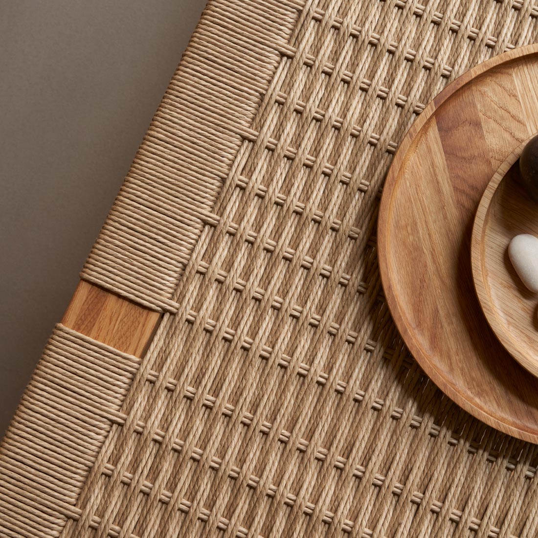 ラタン(籐)仕様との大きな違いは、この緻密なペーパーコードの編み目にあります。熟練の職人が「二重平織り(ダブル平編み)」で隙間なく編み上げることで、座面はしっかりと平らに保たれています。そのため、トレイに乗せた飲み物を置くサイドテーブルとしても安定して使えます。また、ベンチとして腰掛けた際は、木材にはない柔らかな当たりがあり、手で触れるとサラッとした張りのある感触が伝わります。
