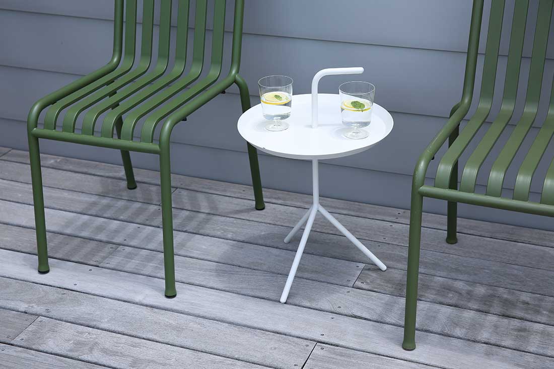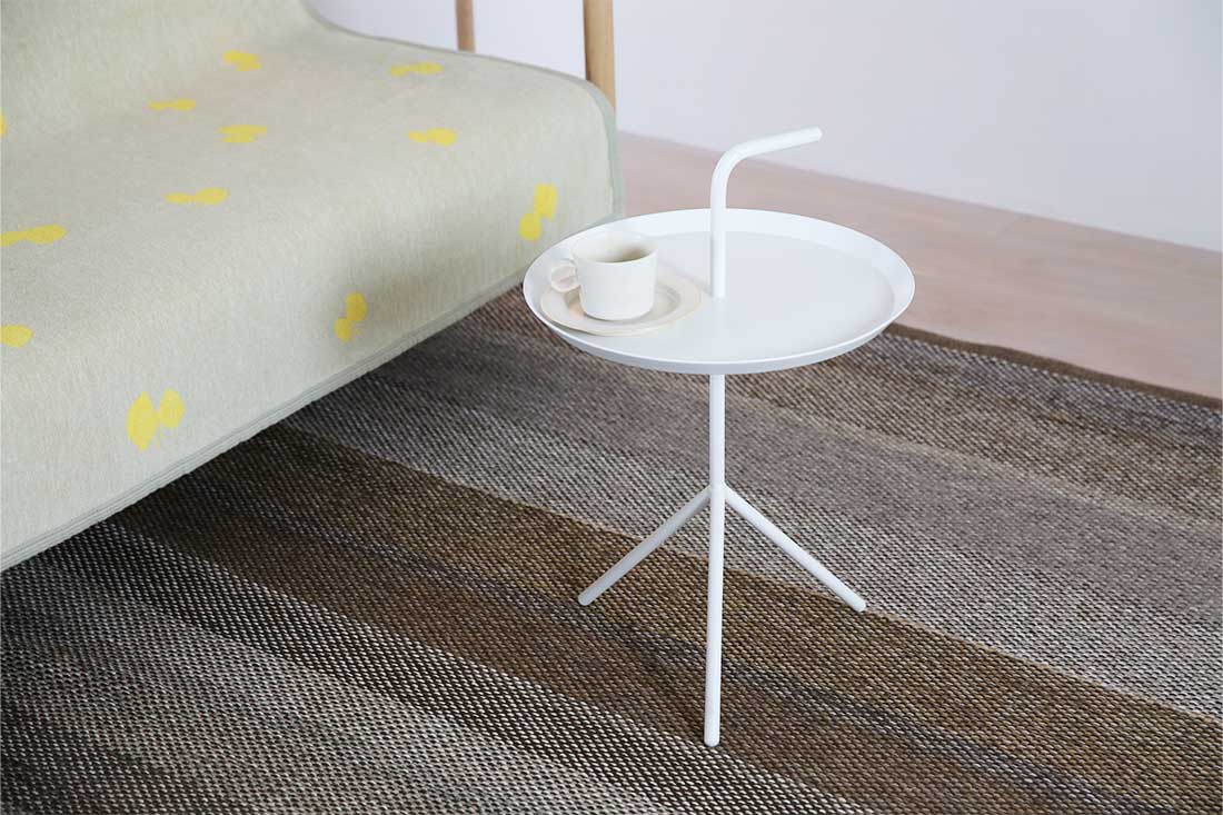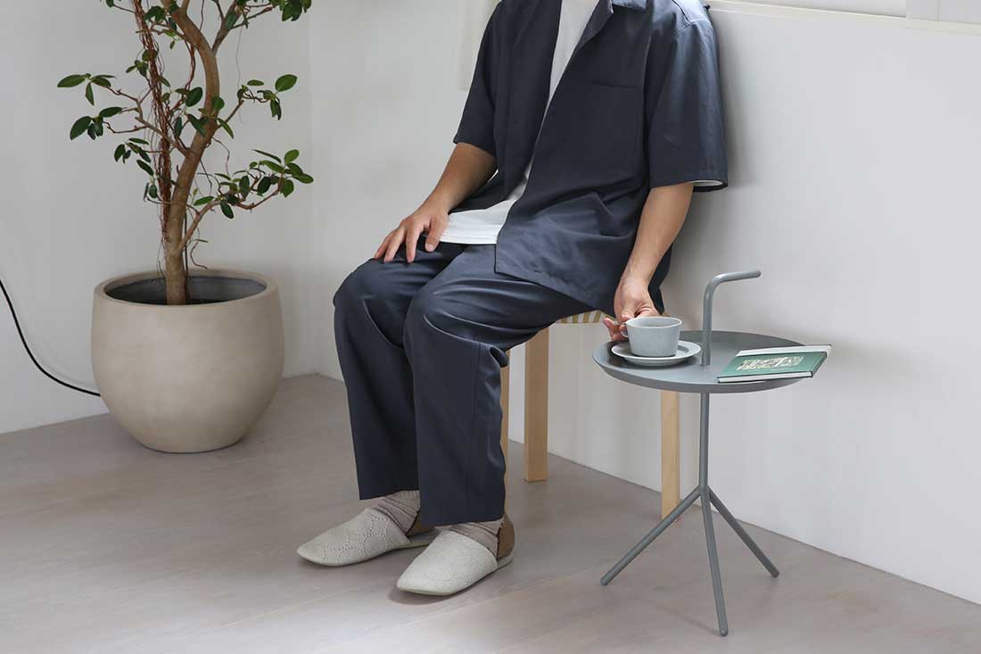 スチール製のDLMは、見た目の軽やかさとは裏腹に、しっかりとした安定感があります。飲み物を置いてもぐらつく心配が少なく、安心して使用できます。また、天板の縁が少し立ち上がったトレー状になっているため、物が滑り落ちにくい工夫もされています。これは、デザイン先行ではなく、日々の暮らしの中で「使いやすさ」を徹底的に追求しているHAYらしいこだわりが感じられる点です。