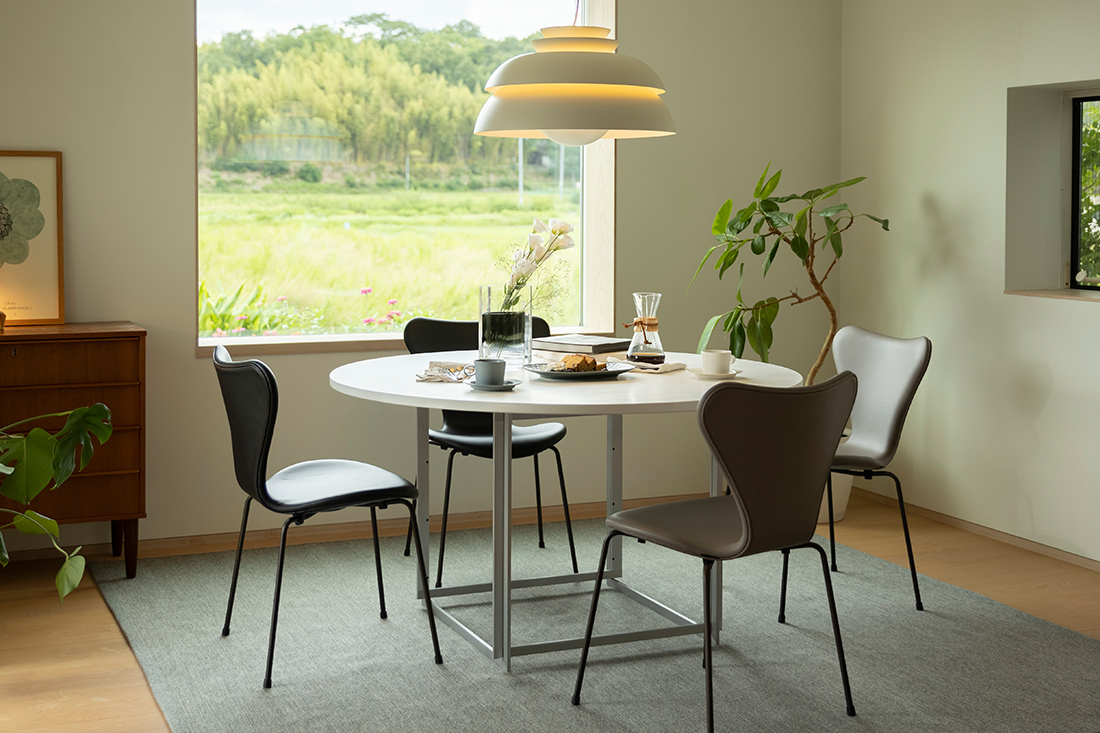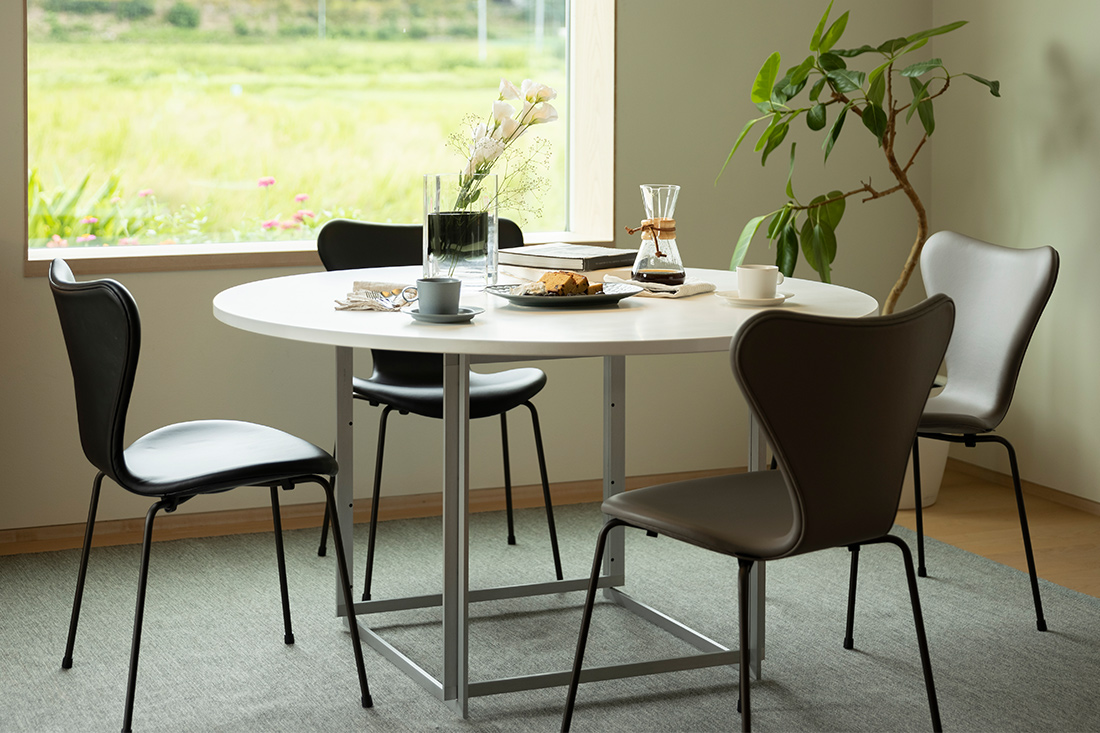 多くの北欧家具が無垢材を活かしたナチュラルな佇まいであるのに対し、『PK58』はミニマルかつ構築的な美をまとった、凛とした存在感を放ちます。木の温もりではなく、静かな緊張感と完璧な均整を愛する人にこそ選ばれる、特別な丸テーブルです。