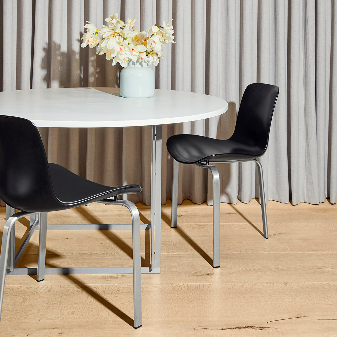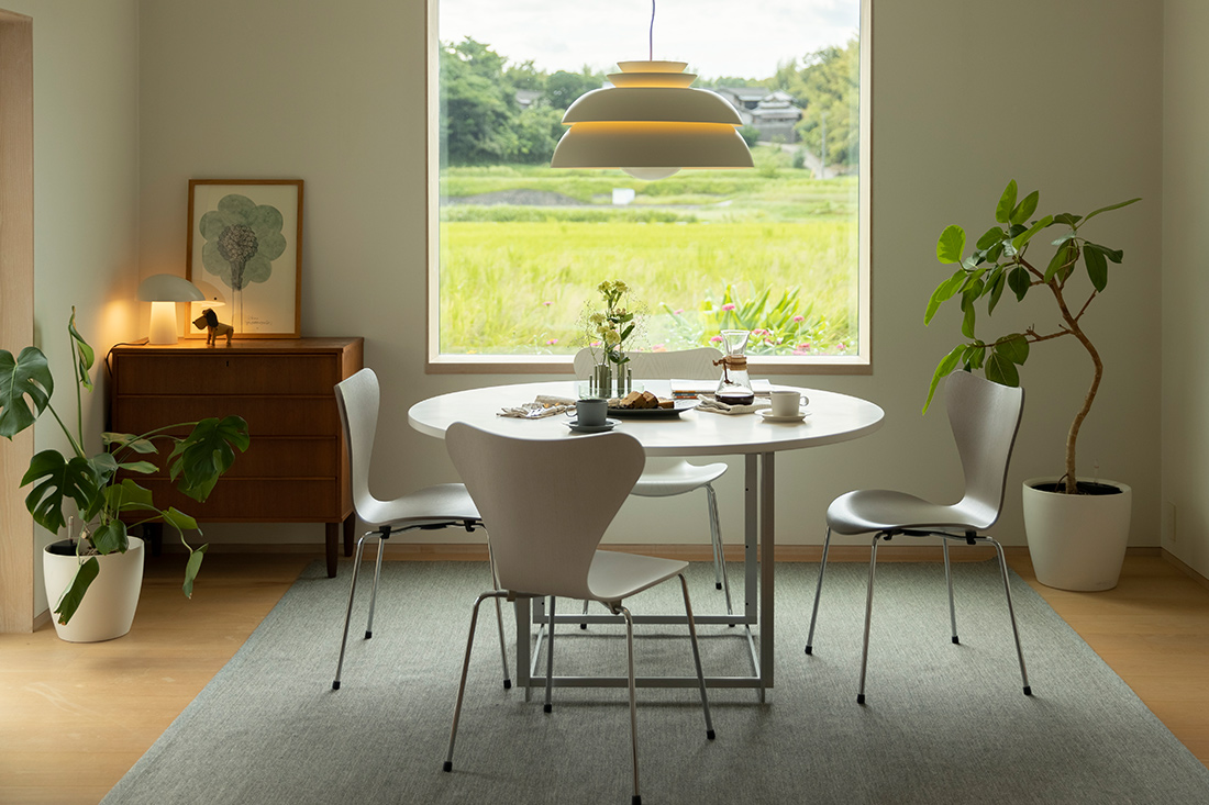 無垢材の椅子や、ファブリック、スチールなど異素材の椅子とも好相性。中立的で軽やかなデザインは、視覚的な圧迫感を与えることなく、空間全体を引き締めてくれます。
