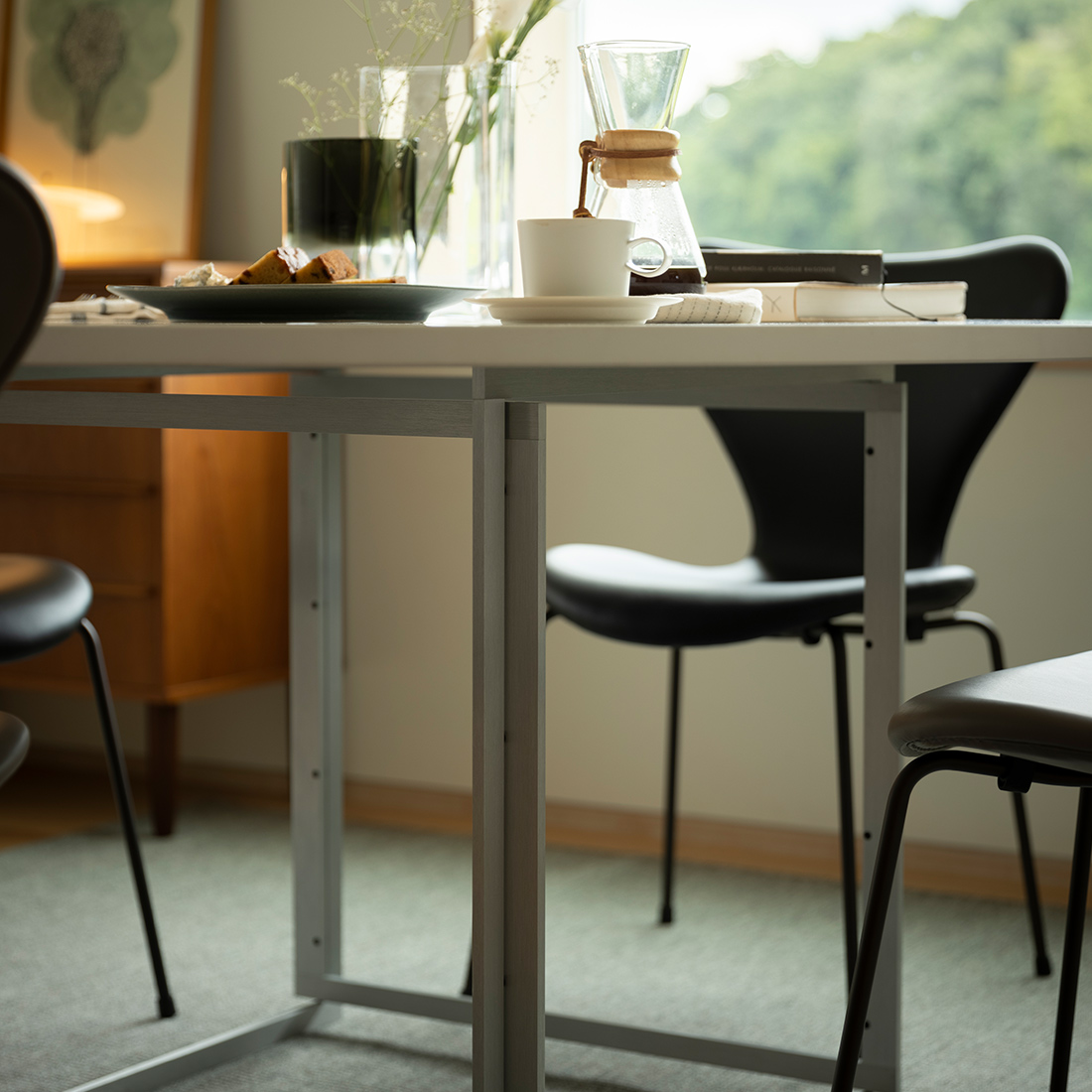 ケアホルム作品に共通する「構造の美」も健在。天板と脚部の接合部には、余計な装飾の一切を排した、静謐なミニマリズムが宿ります。