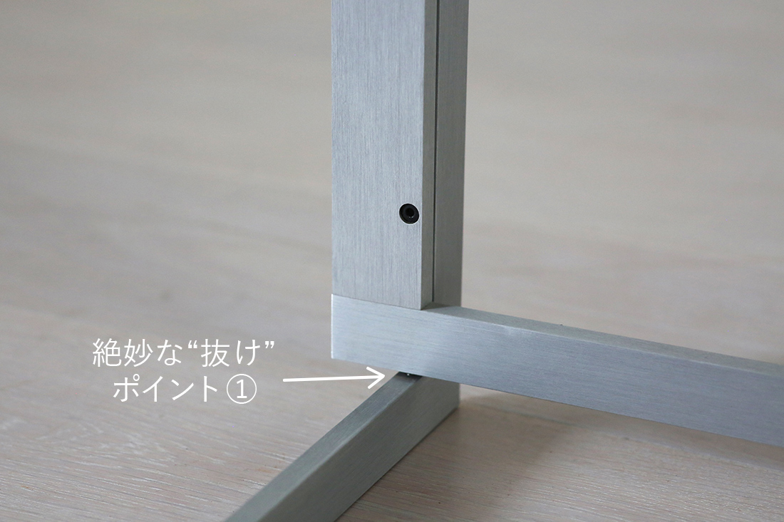 脚の接合部も、ぴたりと噛み合っているように見えつつ、実はわずかに“浮いている”という緻密なつくり。留められているのは、1本の脚につき、わずか4本のビス。それだけで全体の構造的強度を保ちつつ、美しさも損なわない、最小限かつ究極に洗練されたデザインです。
