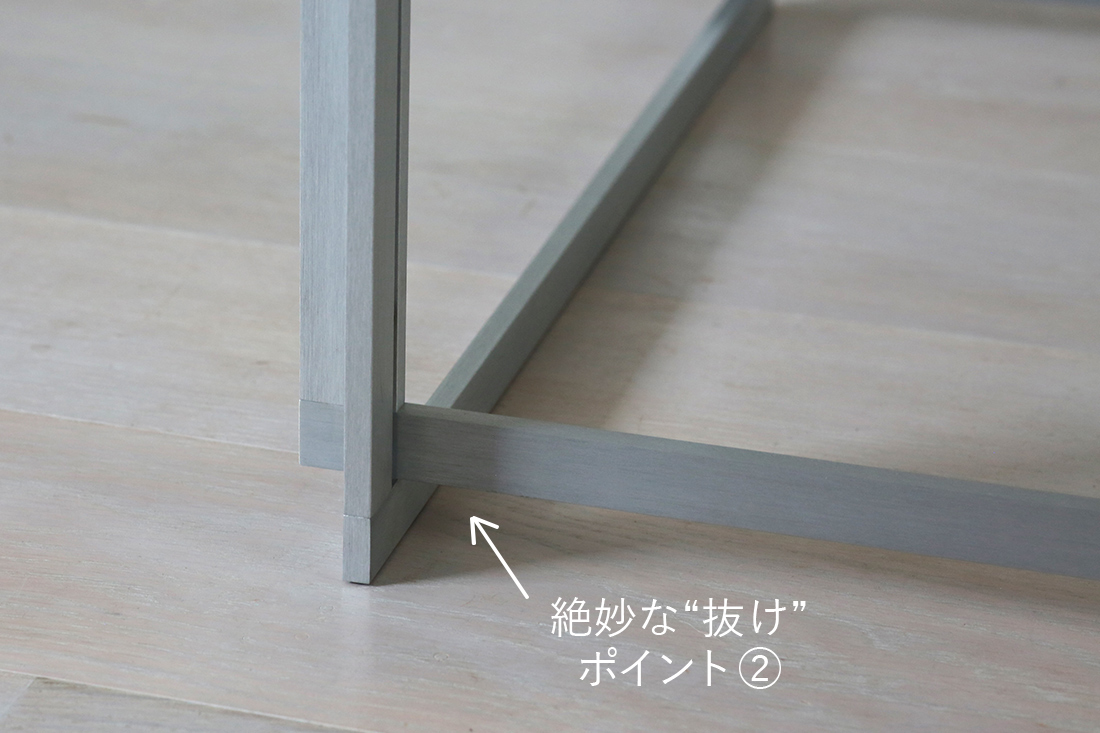 さらに、天板の間に設けられた隙間と同じように、床との設置面にも絶妙な“抜け”があり、まるで天板が宙に浮いているかのような軽やかさを感じさせます。