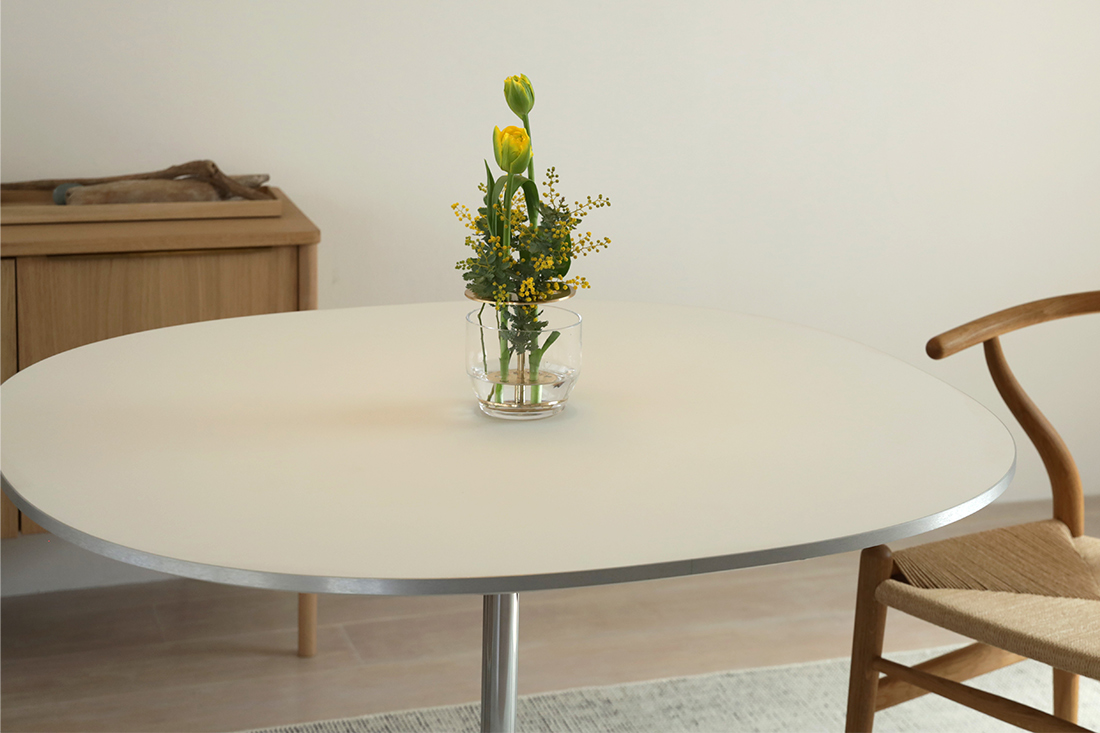 スーパー円テーブルのもう一つの魅力は、その天板の薄さ。まるで浮いているかのような軽やかさを演出し、モダンな印象を強調します。
