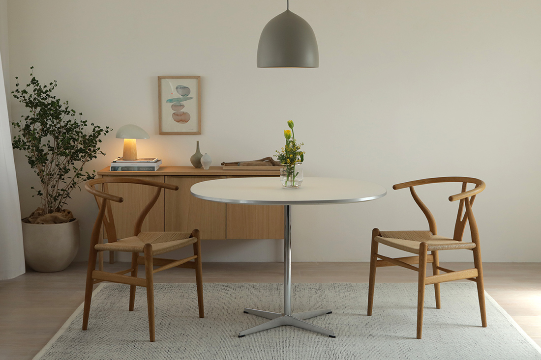 このように、スーパー円テーブルはスタイリッシュでありながら冷たさを感じさせない、上品で柔らかな風合いを持つデザインで、木製家具や木のフローリングとの相性も抜群。