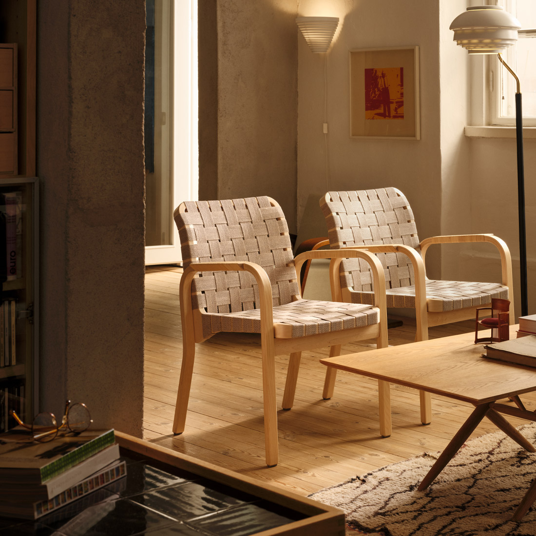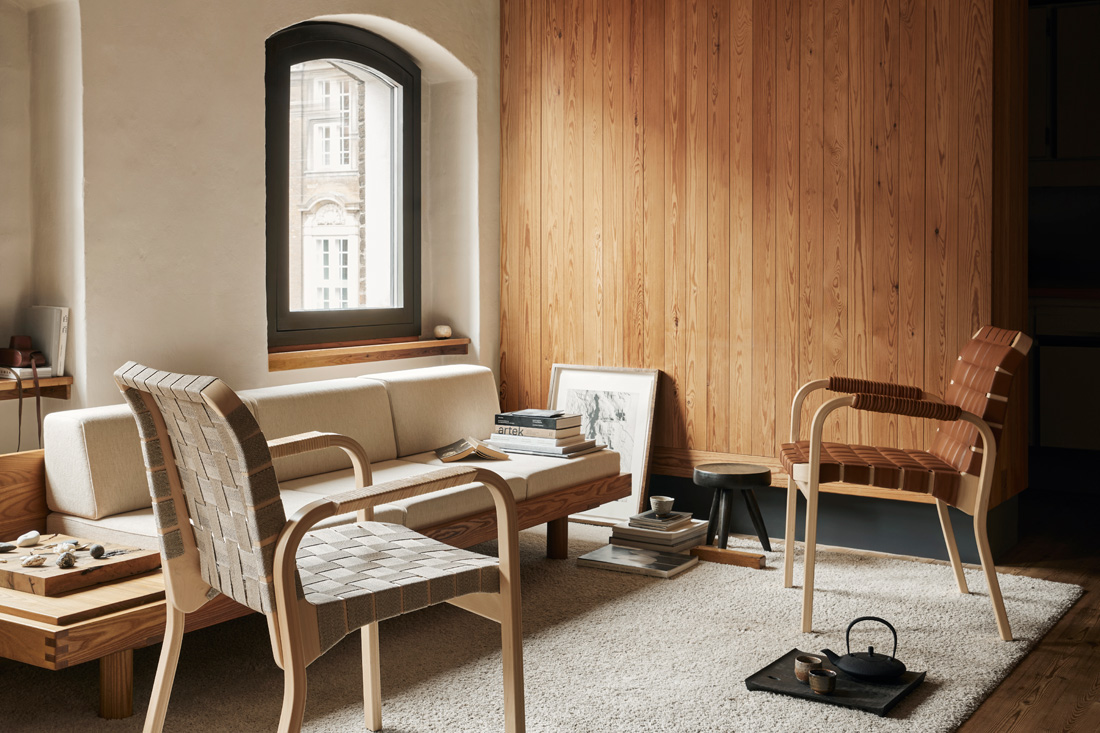 その快適さは、ティーリマキのスタジオで革張りのアームチェア45に腰かけてくつろぐアルヴァ・アアルトのアーカイブ写真が物語っているほど。