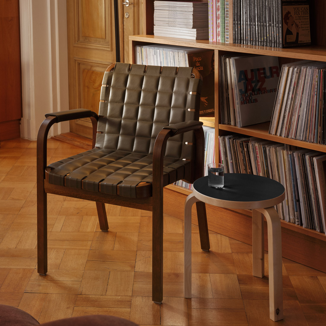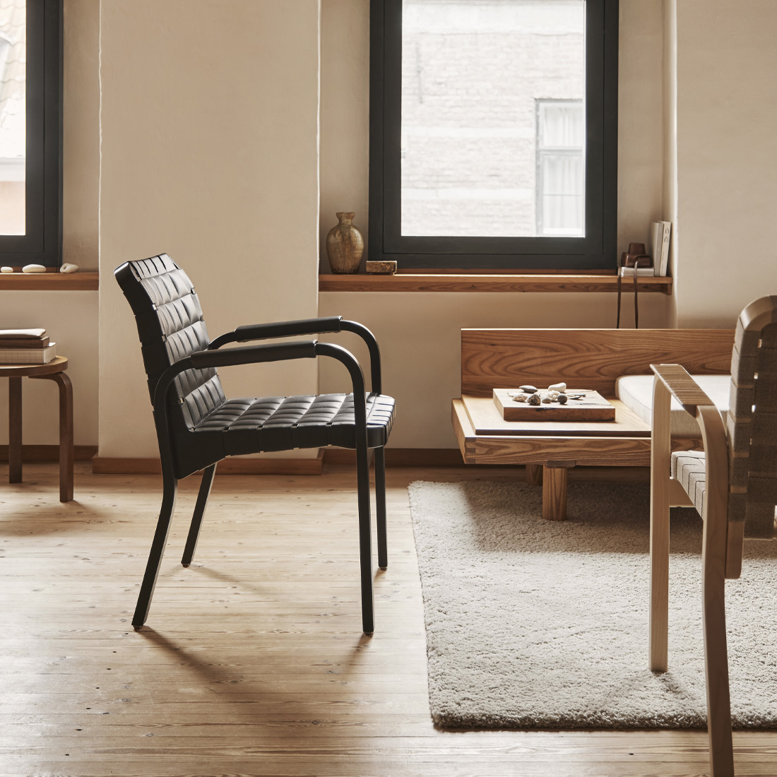 その快適さは、ティーリマキのスタジオで革張りのアームチェア45に腰かけてくつろぐアルヴァ・アアルトのアーカイブ写真が物語っているほど。