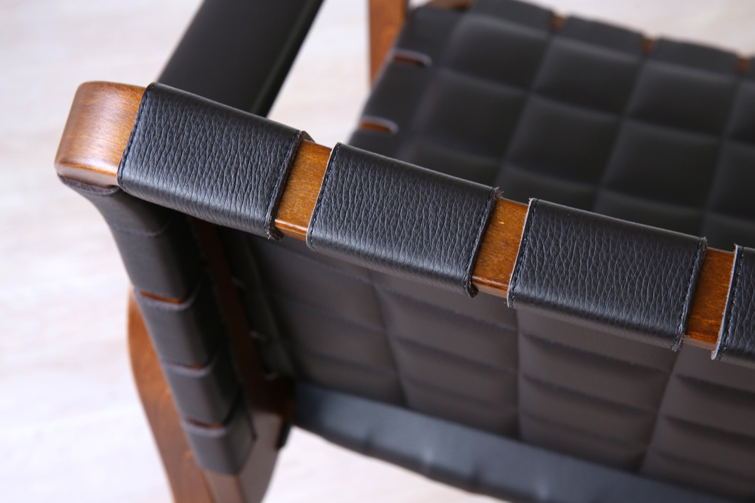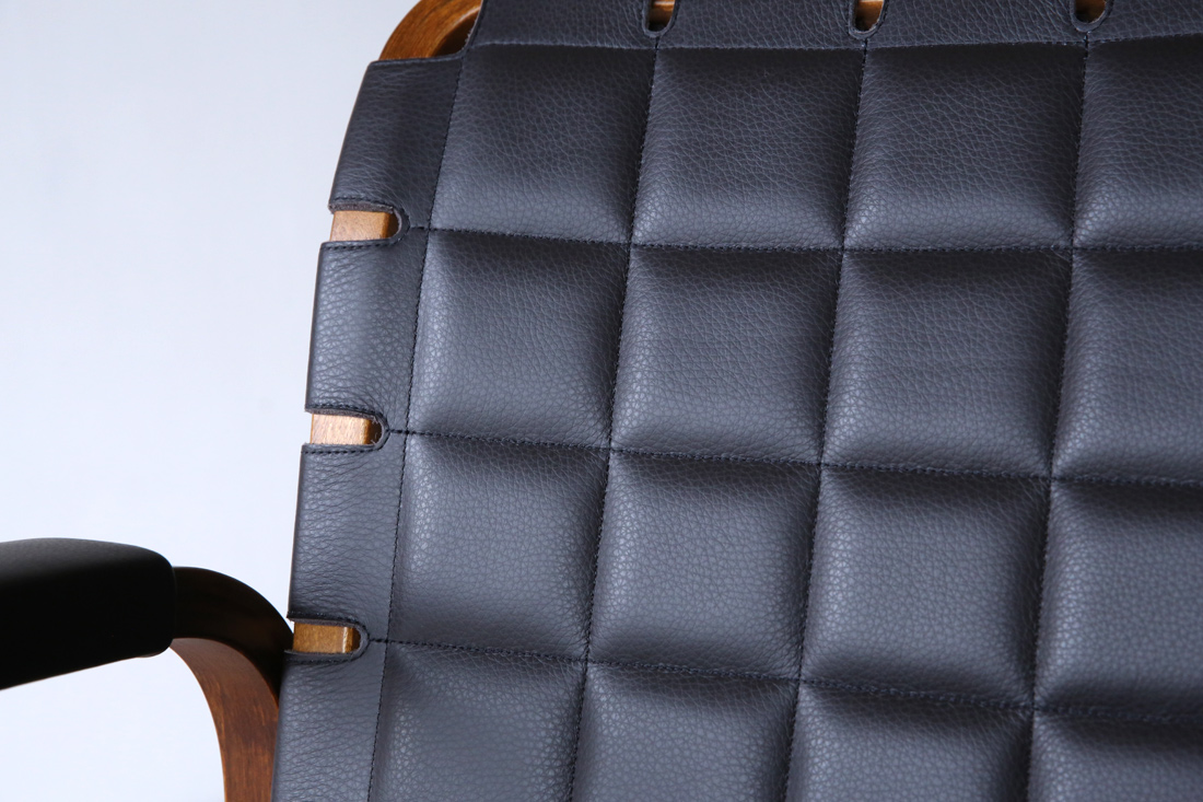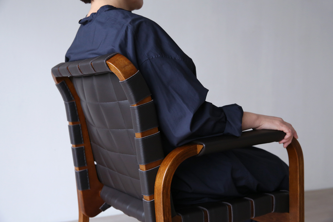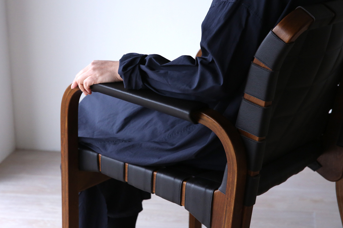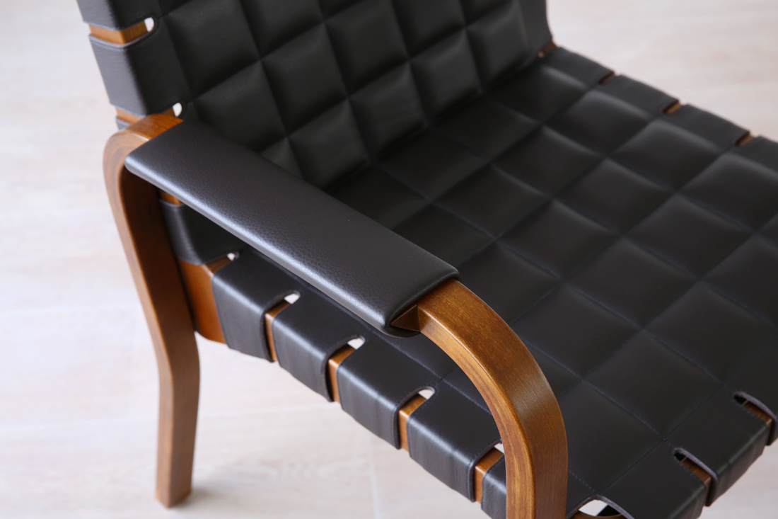 アームレストには同色のレザーカバーが施されおり、手触りの良さと共に、細部までこだわり抜かれた上質感を演出しています。このレザーと木の組み合わせは、アアルトの有機的なデザインに、モダンでエレガントな要素を加えています。