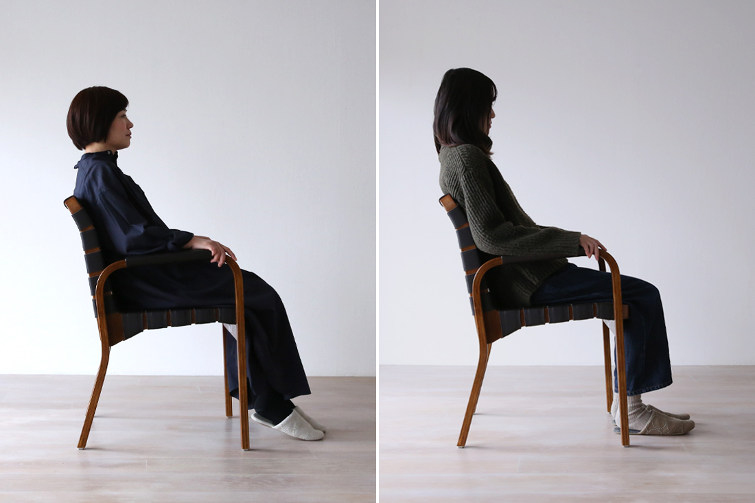 アームチェア45は、現代のニーズに合わせ、座面と肘掛けの高さをやや高く、座面の角度をやや緩やかに変更されてこの度復刻されました。そのため、座面高が45.5mmとやや高めになっています。