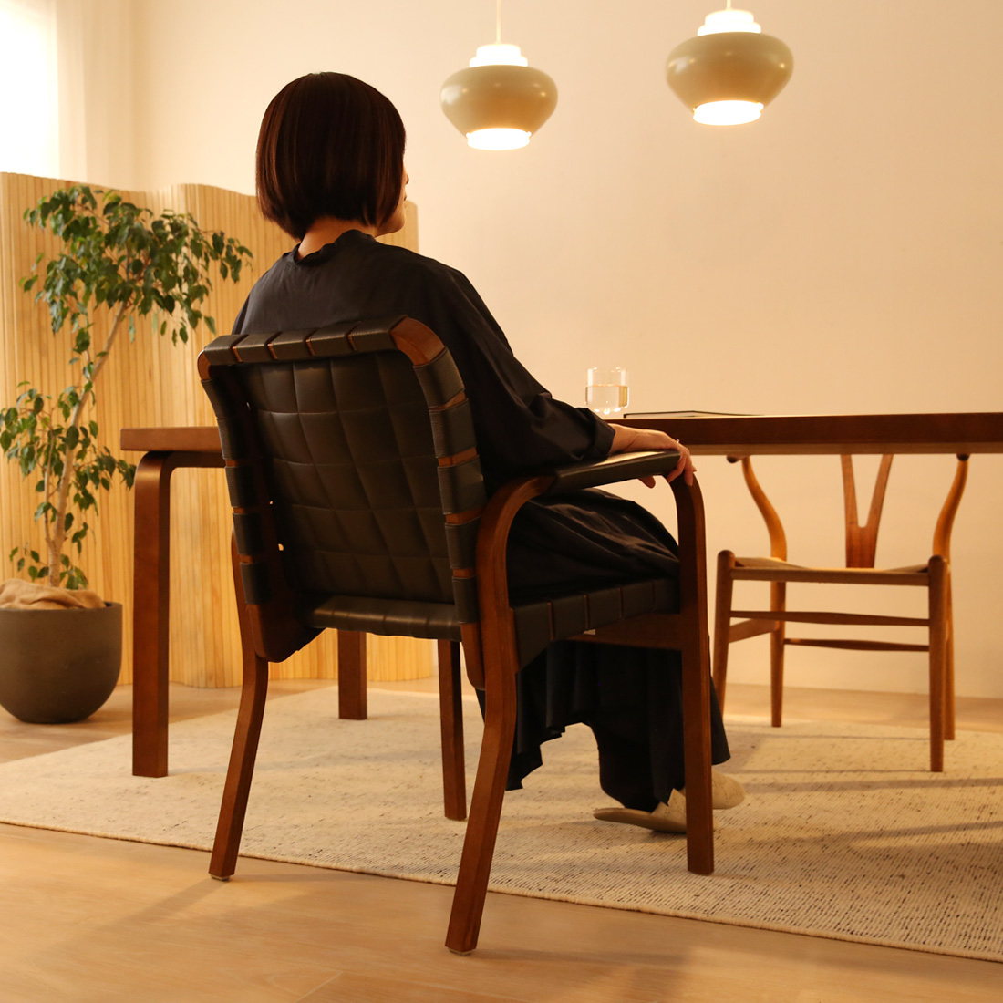 メリットとしては、座面が少し高いことで、ダイニングチェアとして使う際にスムーズに立ち座りができ、身体に負担をかけることなく、楽に立ち上がることができるところ。また、ダイニングで食事の後、そのまま背もたれに身体を預け、食後のお茶や読書の時間を楽しむことができ、緩やかにリラックスタイムへ移行することができるのも、このチェアの大きな魅力です。