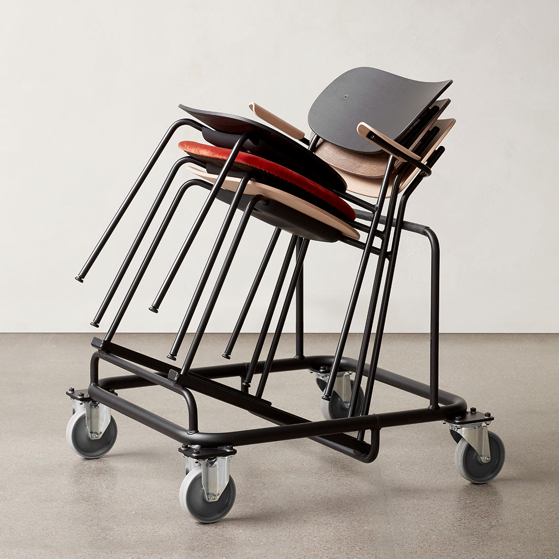 さらに、専用のトロリー(別売り)を使えば、安全かつコンパクトにタワー状に積み上げて移動することができ、保管や搬送もスムーズに行えます。