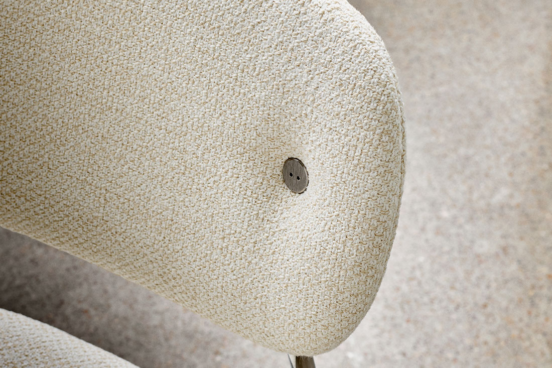 ファブリックやレザーの背もたれには、背面に並んだ2つのボタンがあしらわれていて、やわらかなフォルムにちょっとした遊び心を添えています。一方、プライウッドの場合は、ネジ穴として施された六角穴が構造をあえて見せるデザインに。素朴でユニークな魅力があり、どこか愛らしさも感じられます。