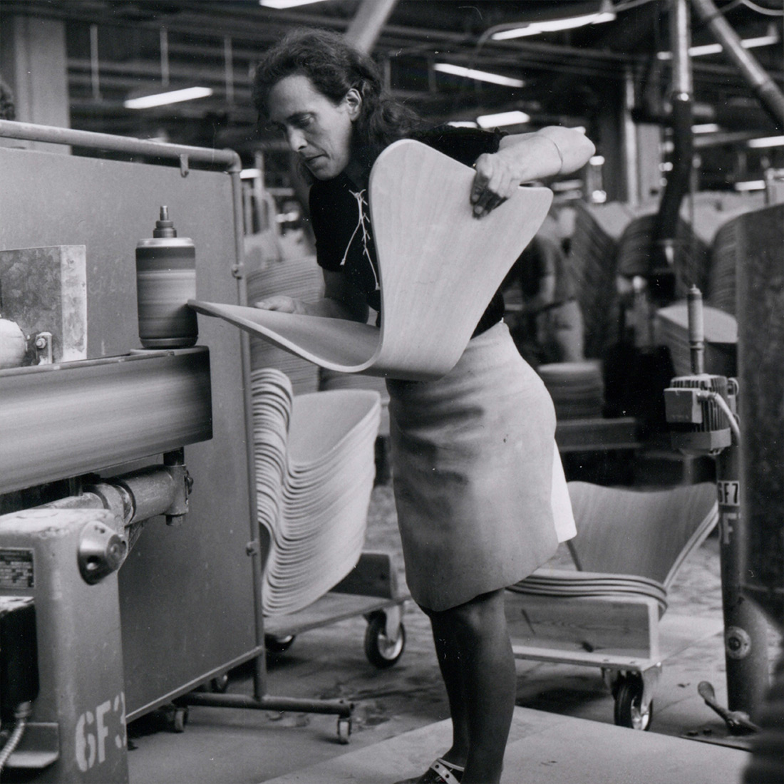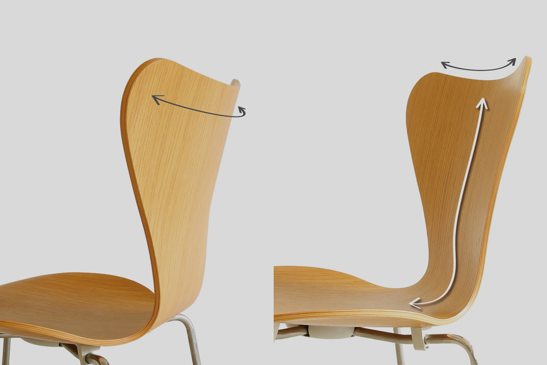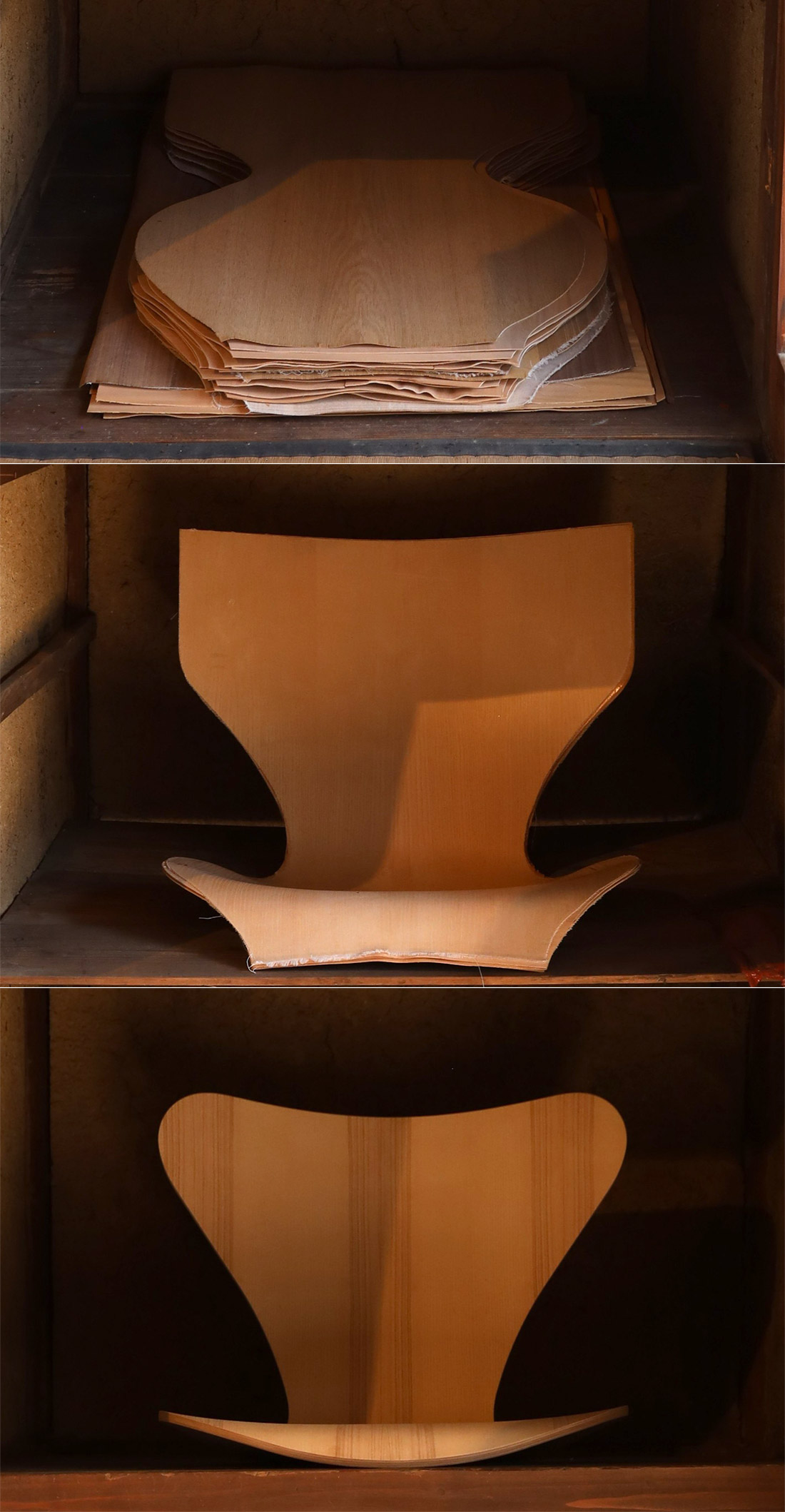 当時、椅子は木を組み合わせて作られるのが主流でしたが、ヤコブセンは、一枚の合板を蒸して曲げる技術をさらに進化させ、より優美で複雑な曲線を持つ椅子を完成させました。