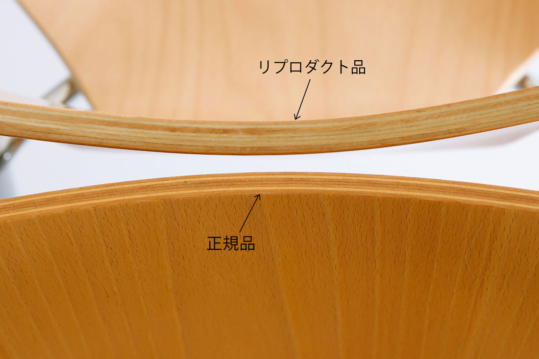 巷では、セブンチェアのコピー品である「リプロダクト」と呼ばれる製品が安価で出回っていることがありますが、デザインのディテールや背もたれのしなり具合、素材の良さ、そして何より耐久性が全く異なります。