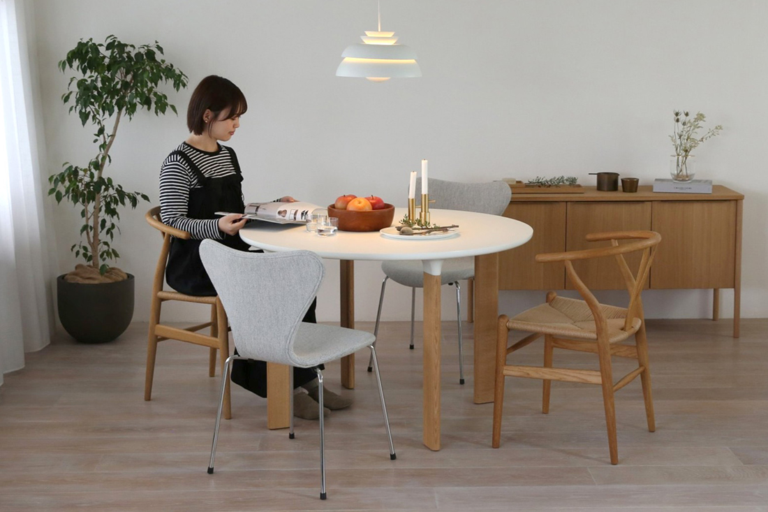 ▲ ダイニングテーブル:アナログ円テーブル + アームチェア: CARL HANSEN & SON / Yチェア