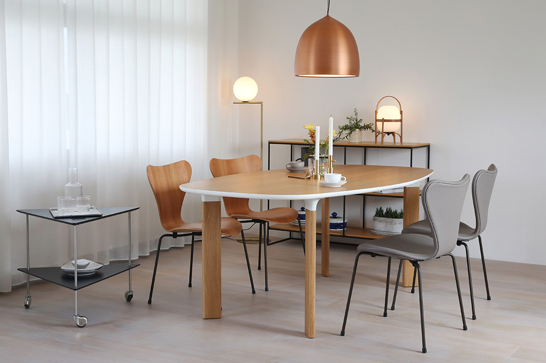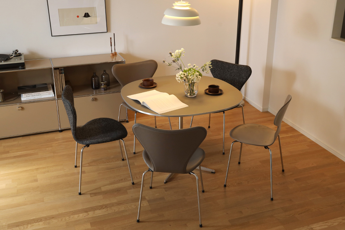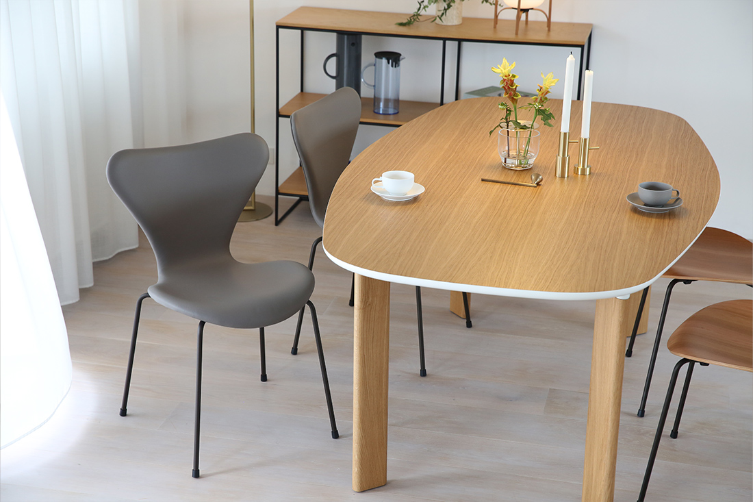 これにアームのないセブンチェアを合わせることで、小スペースでも空間を最大限に活用し、複数人で囲んで食事や作業ができる、機能的で美しい空間の完成です。