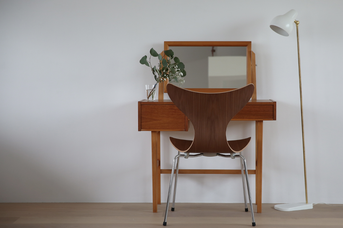 全体的に木でできた温かみのあるヴィンテージ家具と、ヴィンテージチェアにはないリリーの艶やかなクローム脚が、すっきりとモダンな印象を与えます。